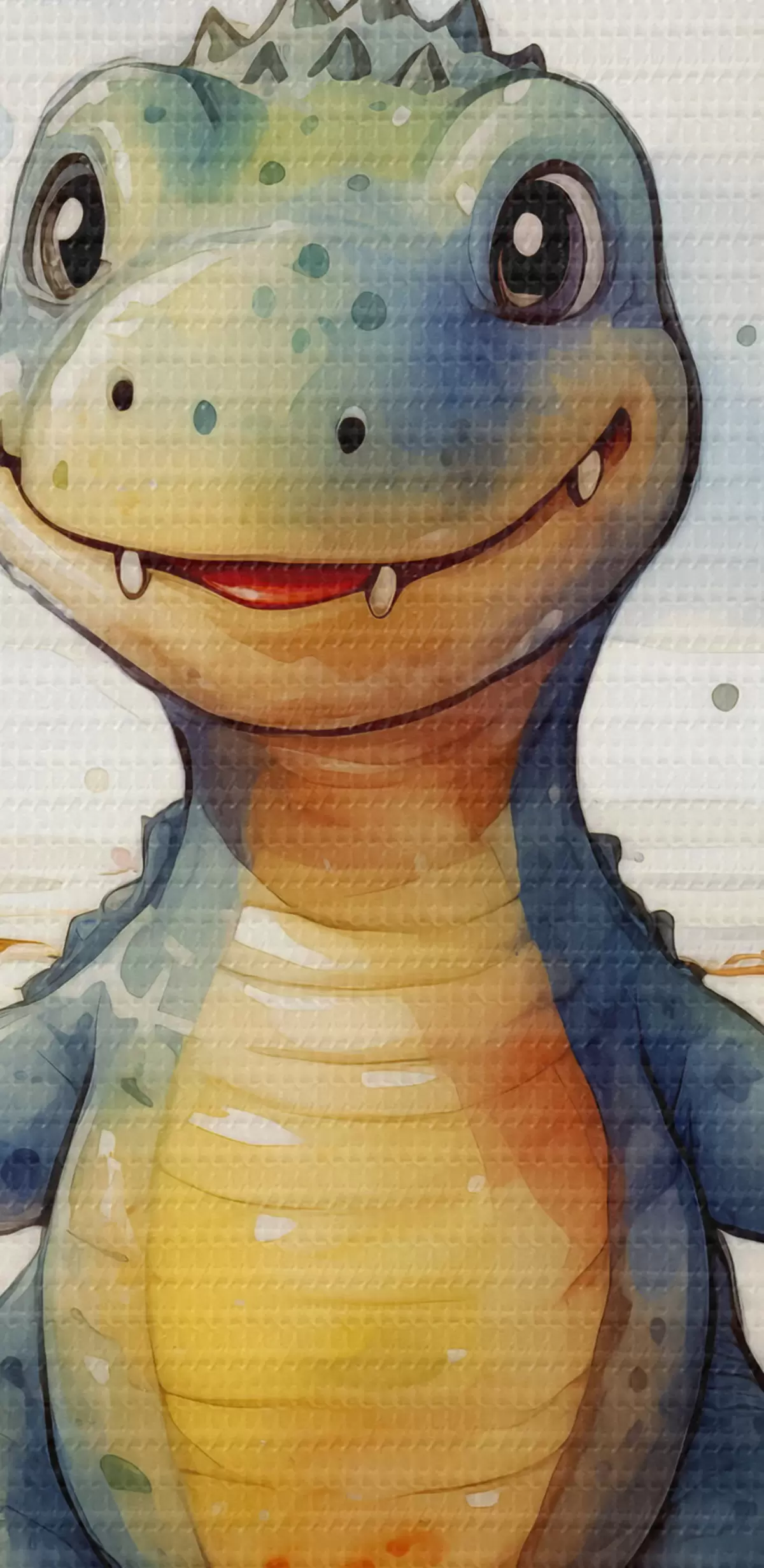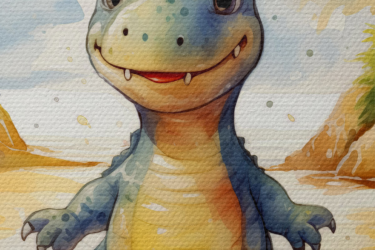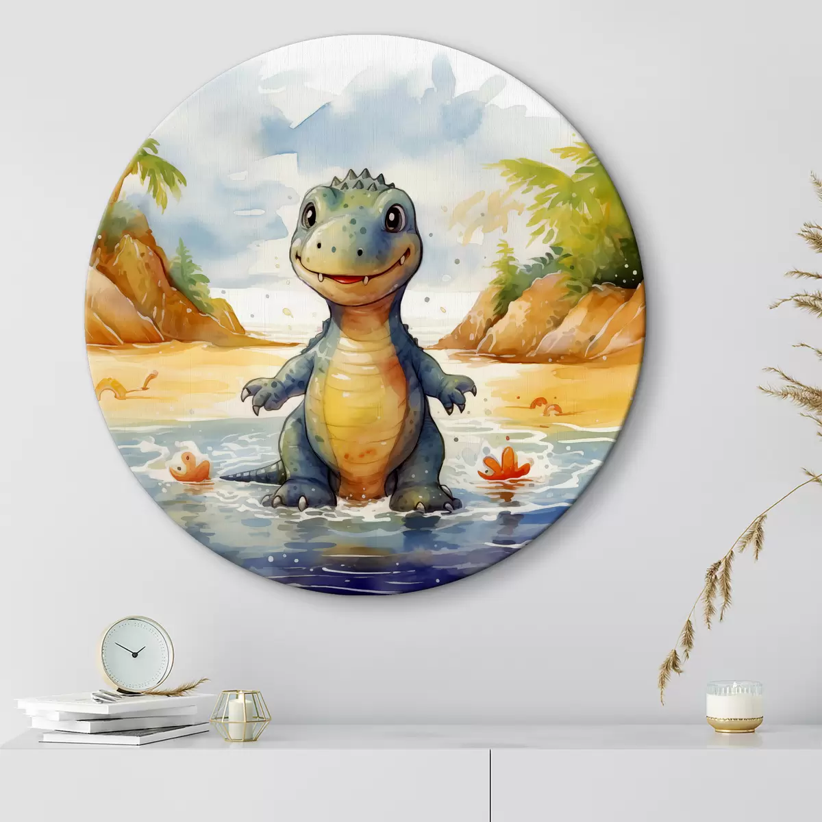 Picturi rotunde Dinozaur în râu pe fundal de munți și ferigi acuarelă Nr r39930