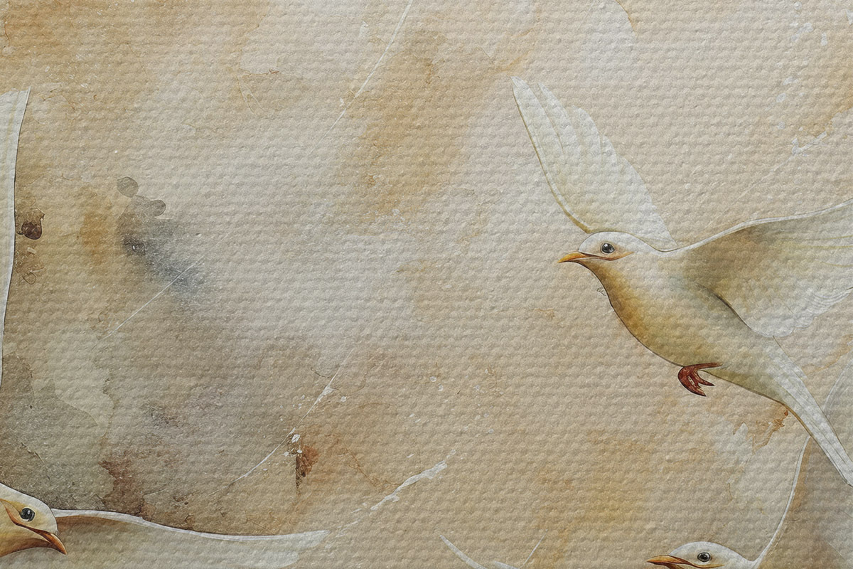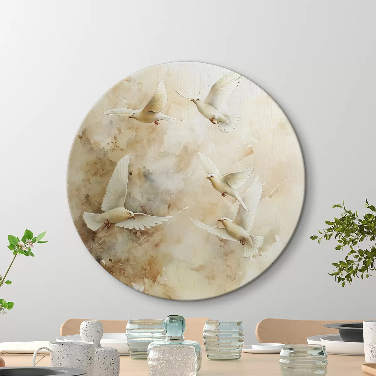 Picturi rotunde Acuarelă porumbei zburători, culori moi bej și alb Nr r39977