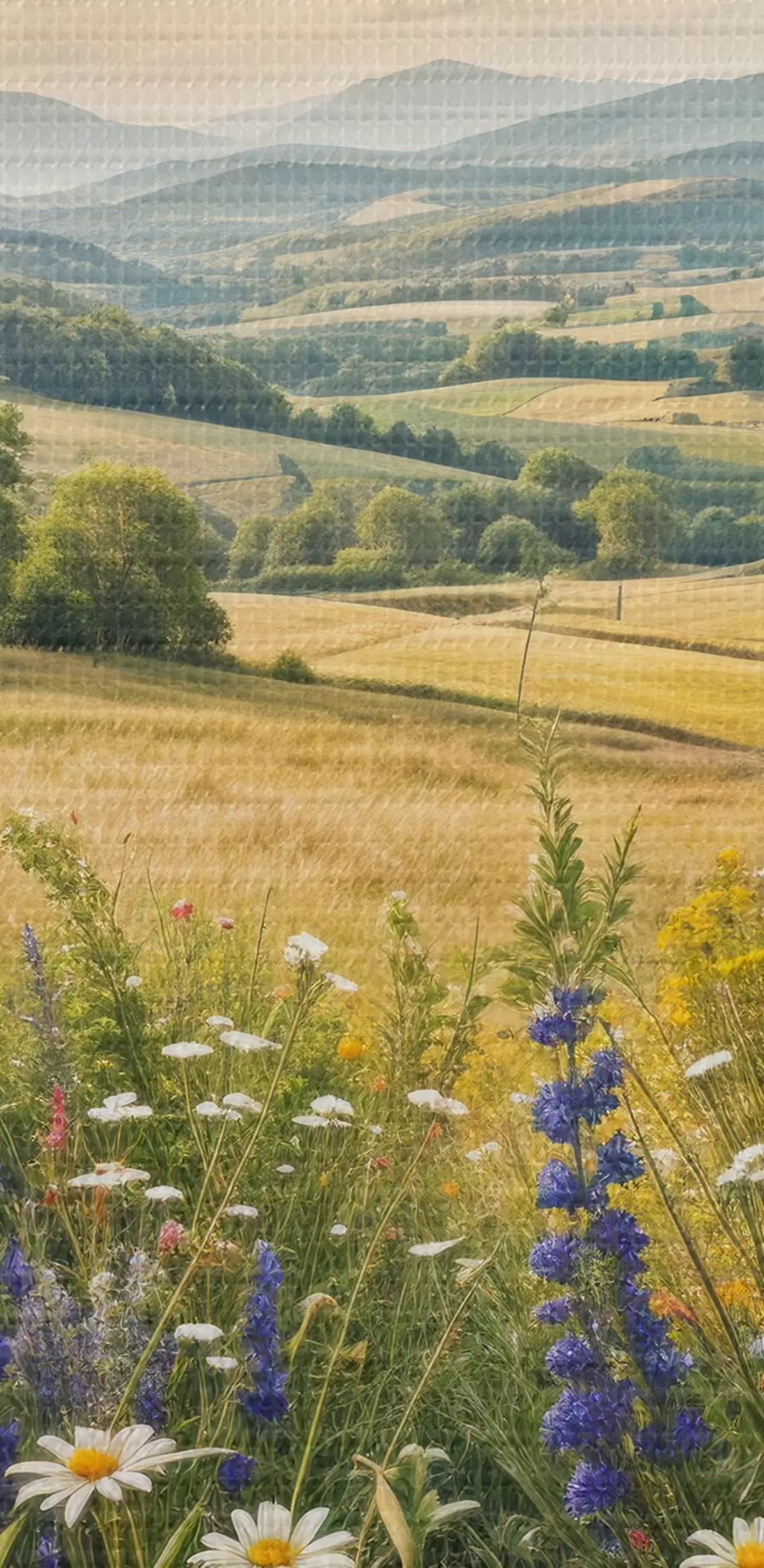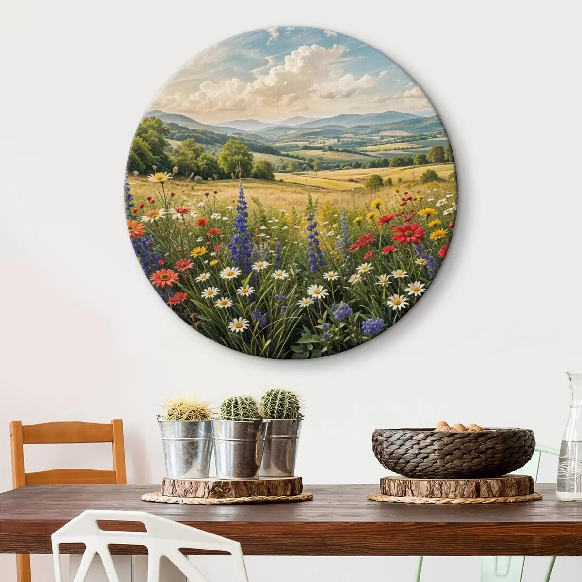 Picturi rotunde Un peisaj rural luxuriant cu o pajiște vibrantă de flori sălbatice plină de flori colorate sub un cer noros Nr r40018