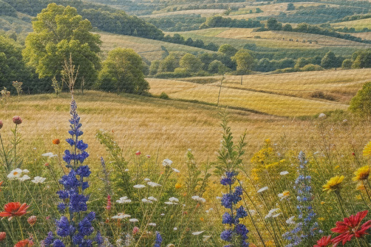 Picturi rotunde Un peisaj rural luxuriant cu o pajiște vibrantă de flori sălbatice plină de flori colorate sub un cer noros r40018