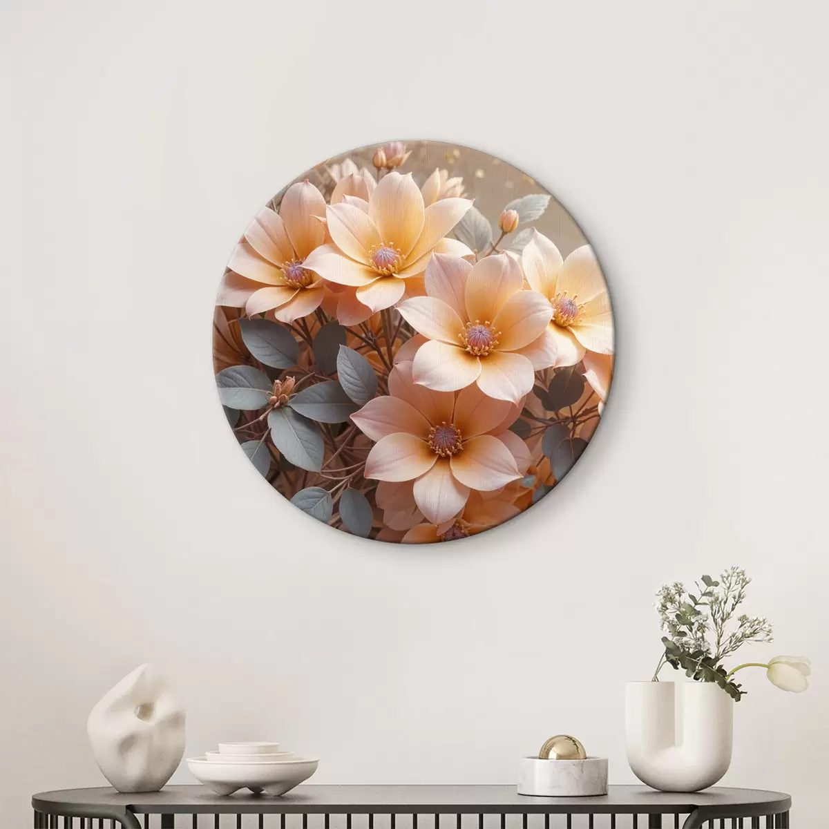 Picturi rotunde Delicate flori dahlia de culoarea piersicii în plină înflorire, cu petale moi pe un fundal neclar Nr r40024