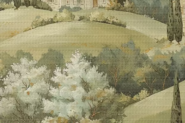 Picturi rotunde Peisaj cu case de epocă, culori verzi pastelate, desen acrilic, vară Nr r40078