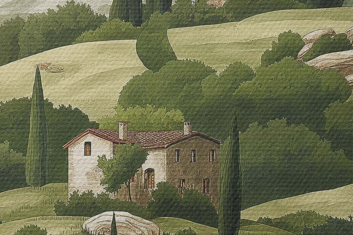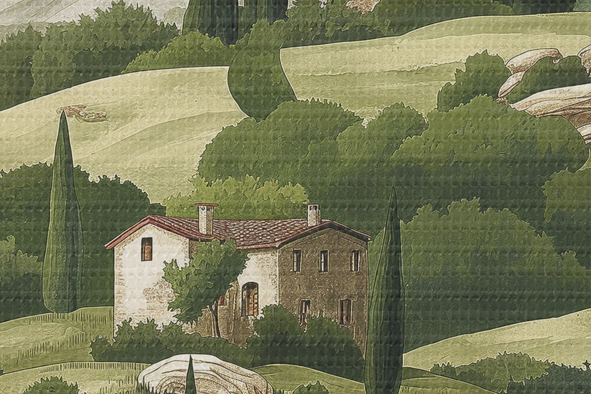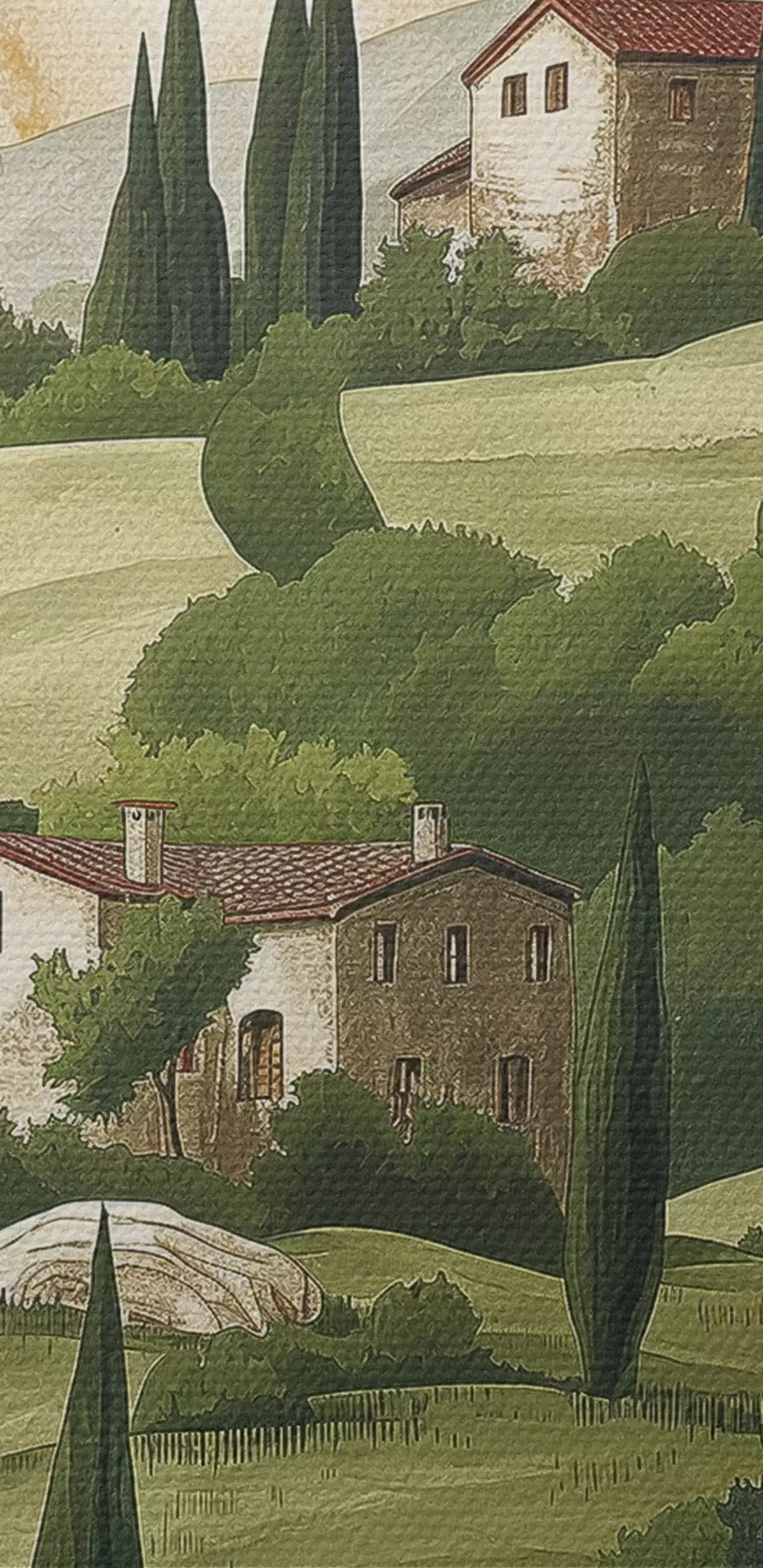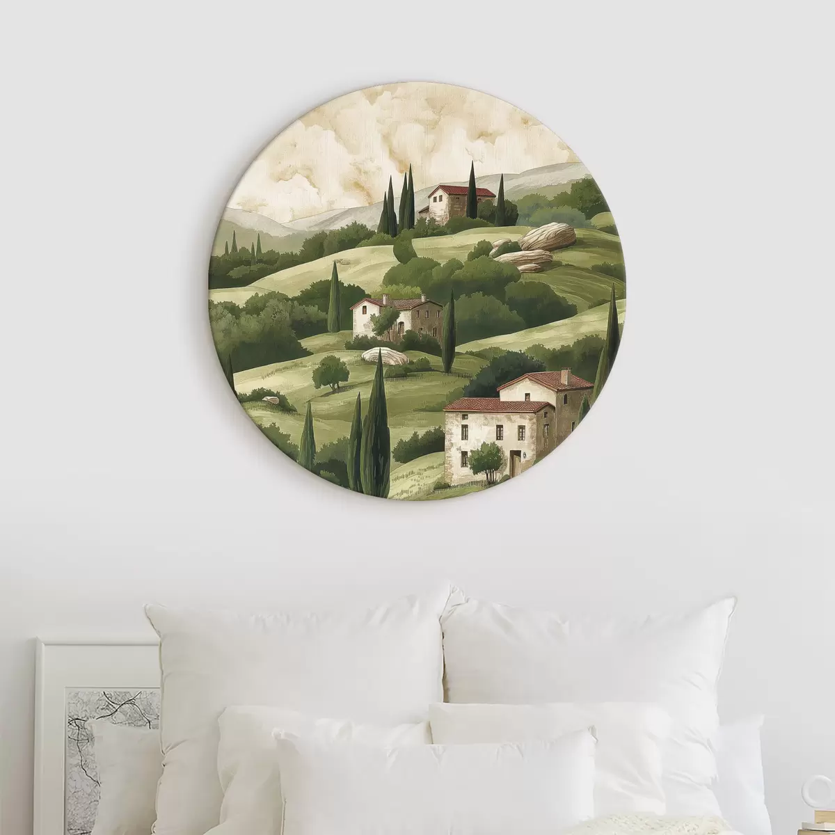 Picturi rotunde Peisaj cu case de epocă, culori verzi pastelate, desen acrilic, rustic Nr r40080