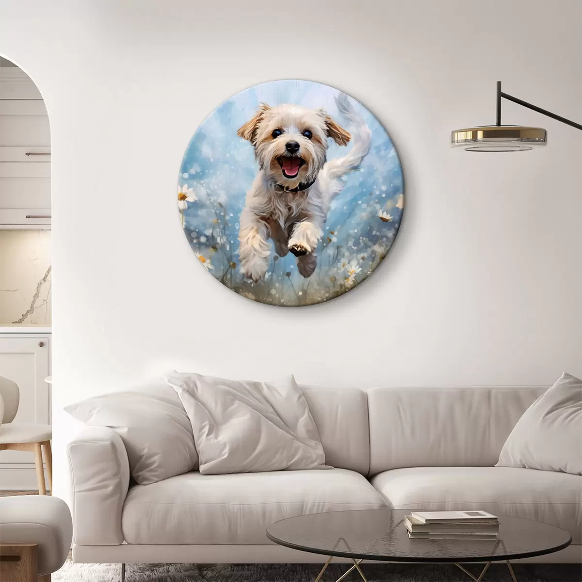 Picturi rotunde Mic câine alb sărind printre margarete pe un fundal albastru acuarelă Nr r40092