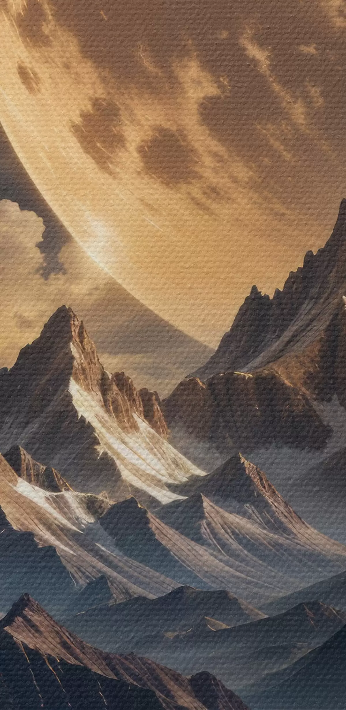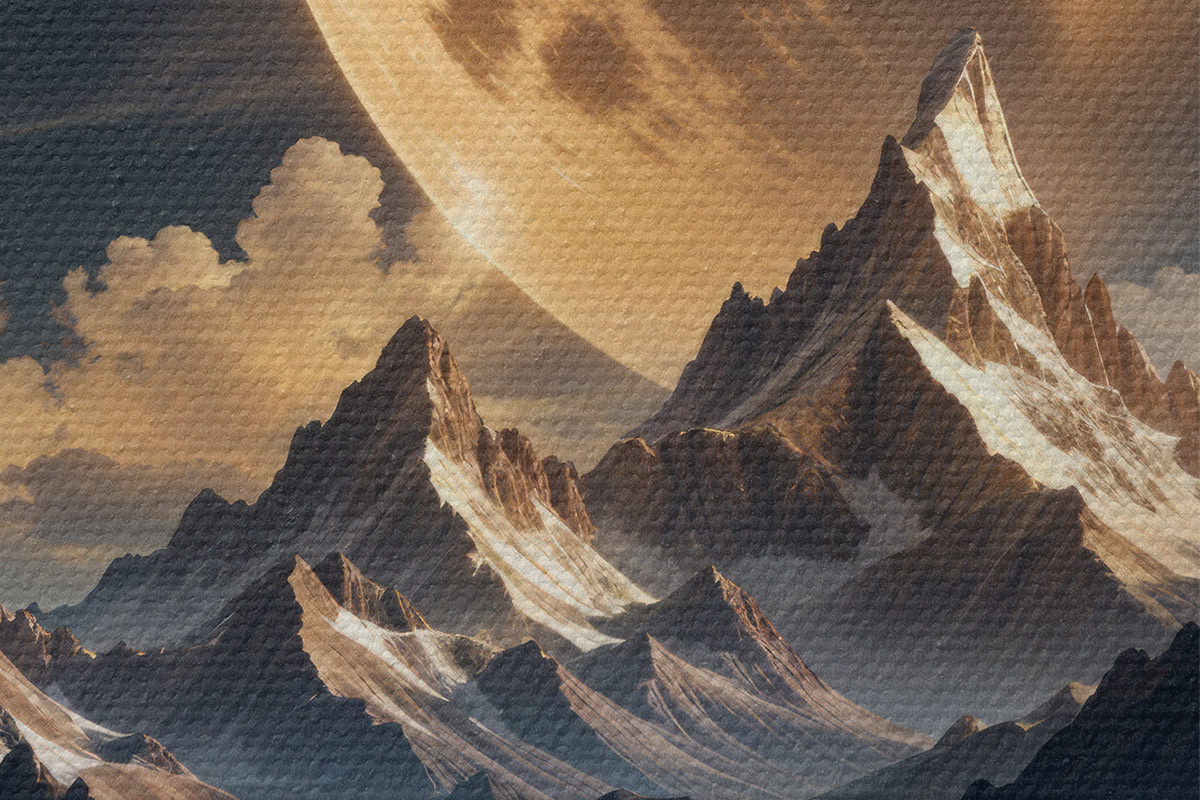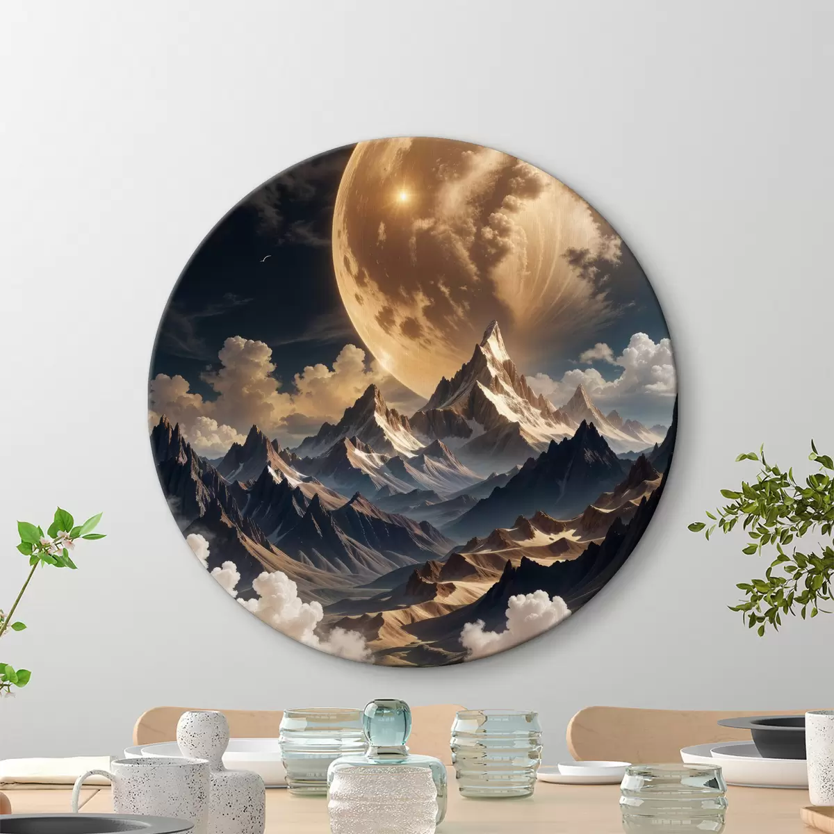 Picturi rotunde Un peisaj suprarealist cu munți acoperiți de zăpadă sub o lună plină masivă, cu nori pufoși Nr r40147