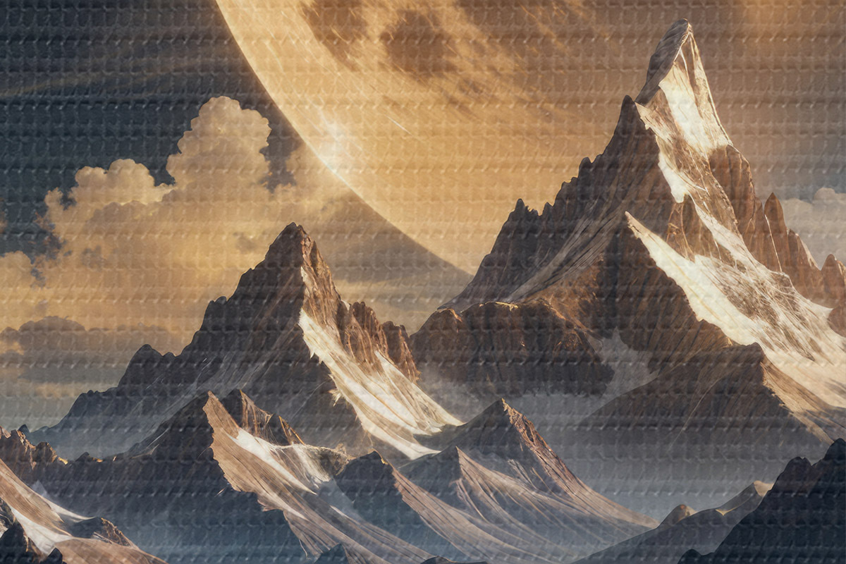 Picturi rotunde Un peisaj suprarealist cu munți acoperiți de zăpadă sub o lună plină masivă, cu nori pufoși r40147