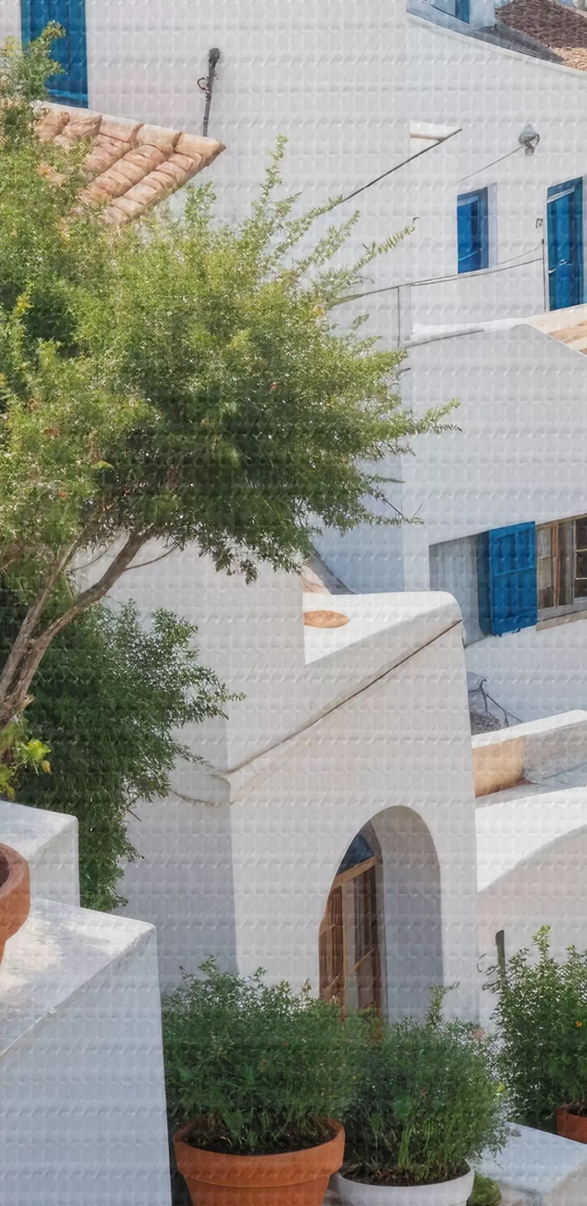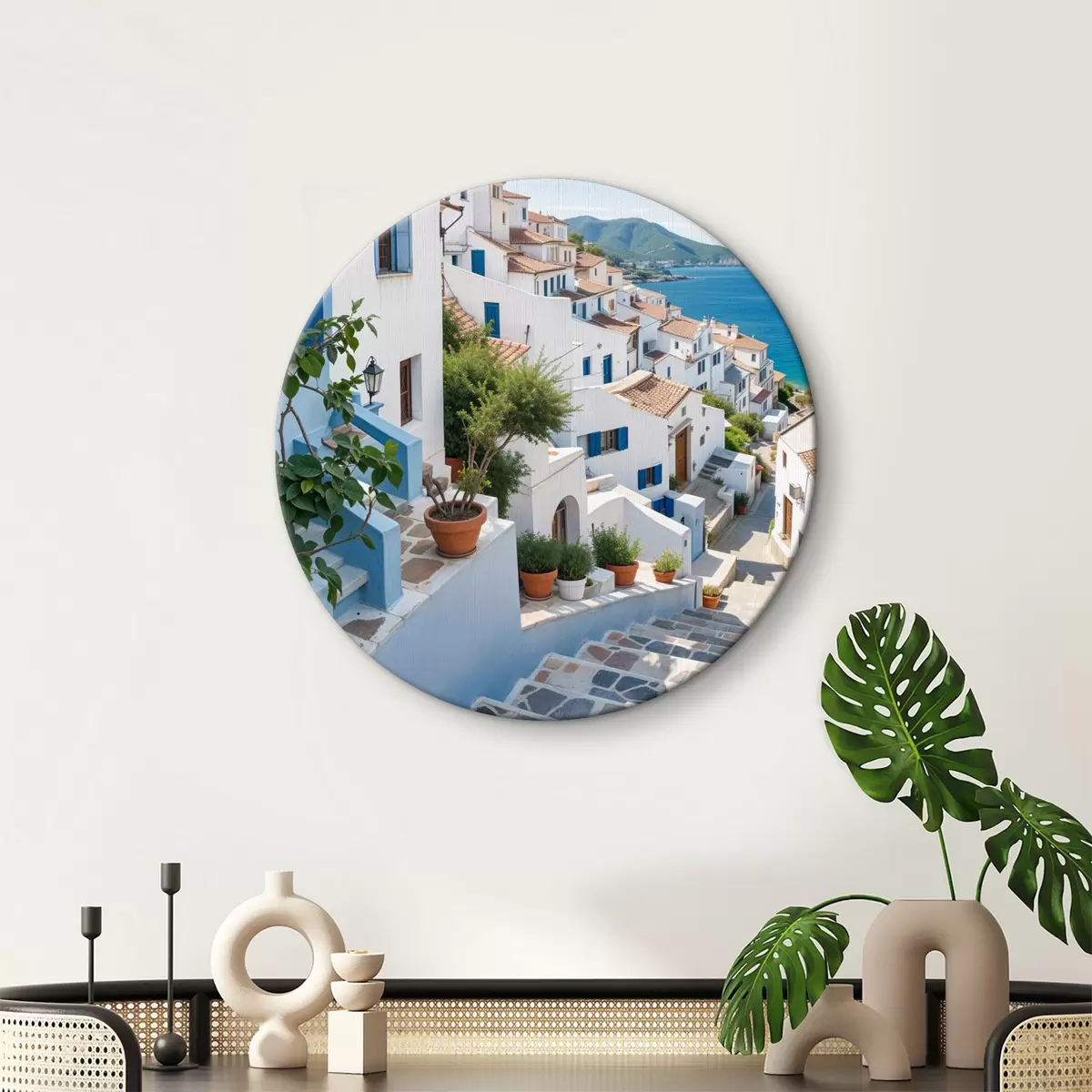 Picturi rotunde Un oraș de coastă pitoresc, cu clădiri albe, ferestre albastre și ghivece de plante pe străzile înguste r40148