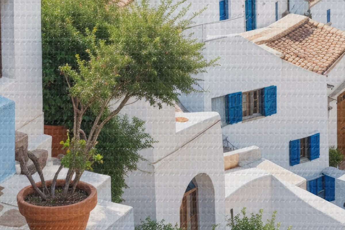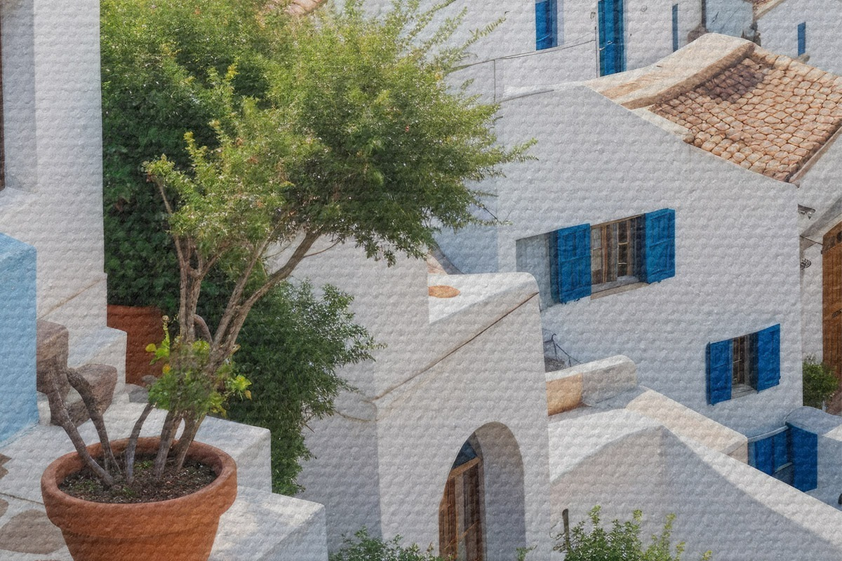 Picturi rotunde Un oraș de coastă pitoresc, cu clădiri albe, ferestre albastre și ghivece de plante pe străzile înguste Nr r40148