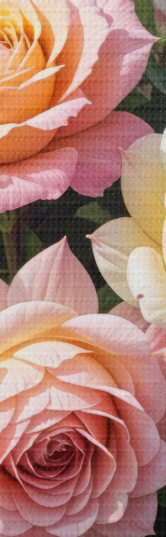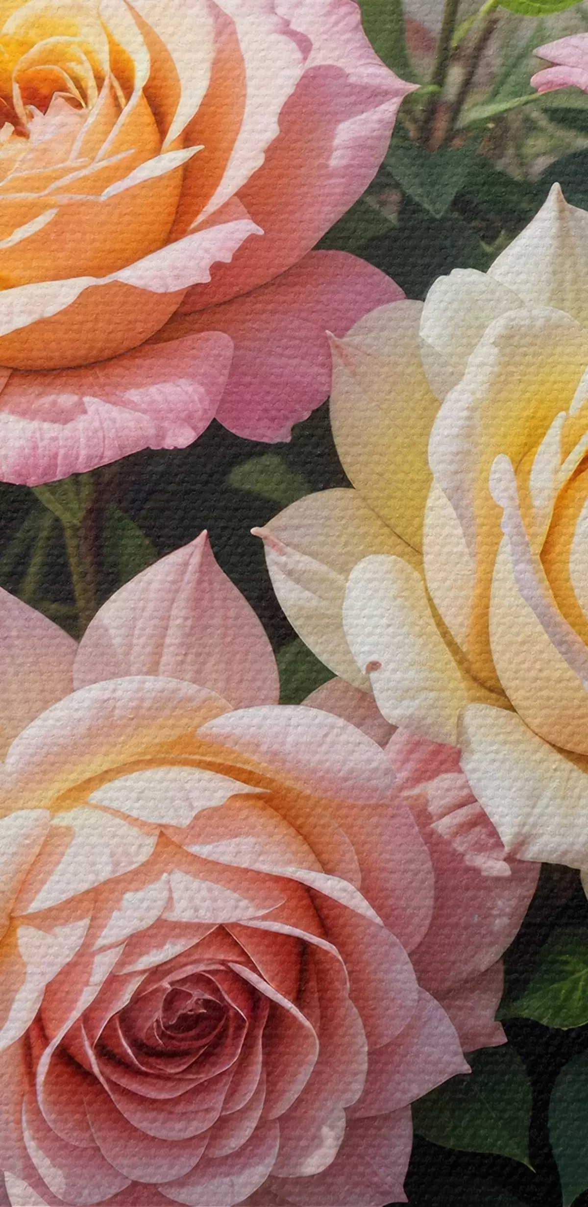 Picturi rotunde Un buchet de trandafiri colorați în diferite nuanțe de roz, galben și portocaliu, aranjați cu frunze verzi r40149