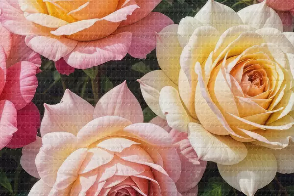 Picturi rotunde Un buchet de trandafiri colorați în diferite nuanțe de roz, galben și portocaliu, aranjați cu frunze verzi r40149
