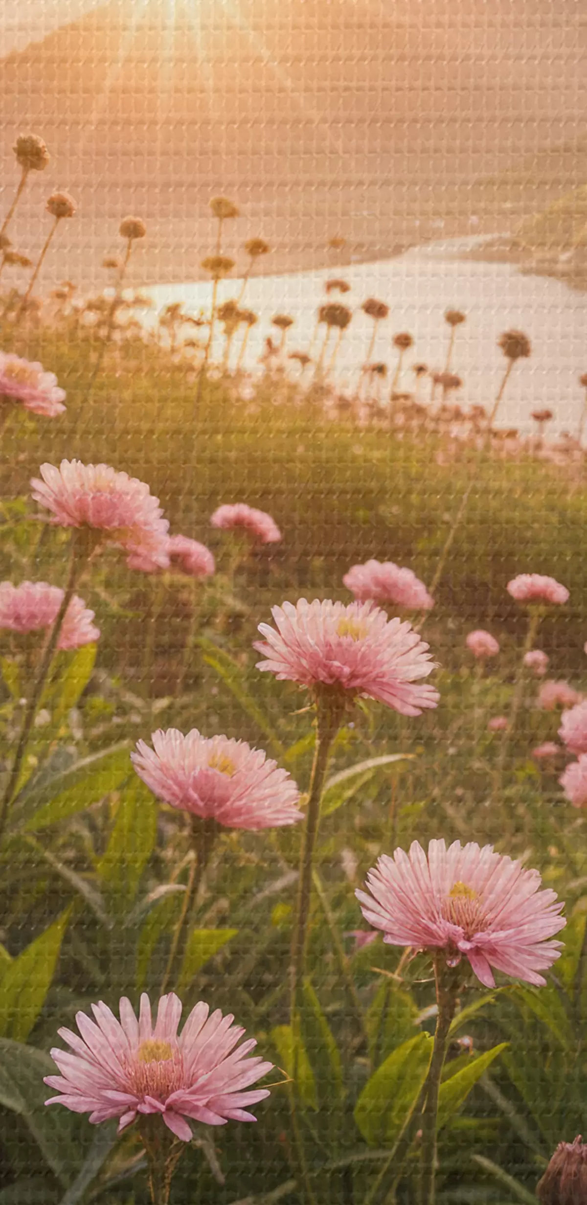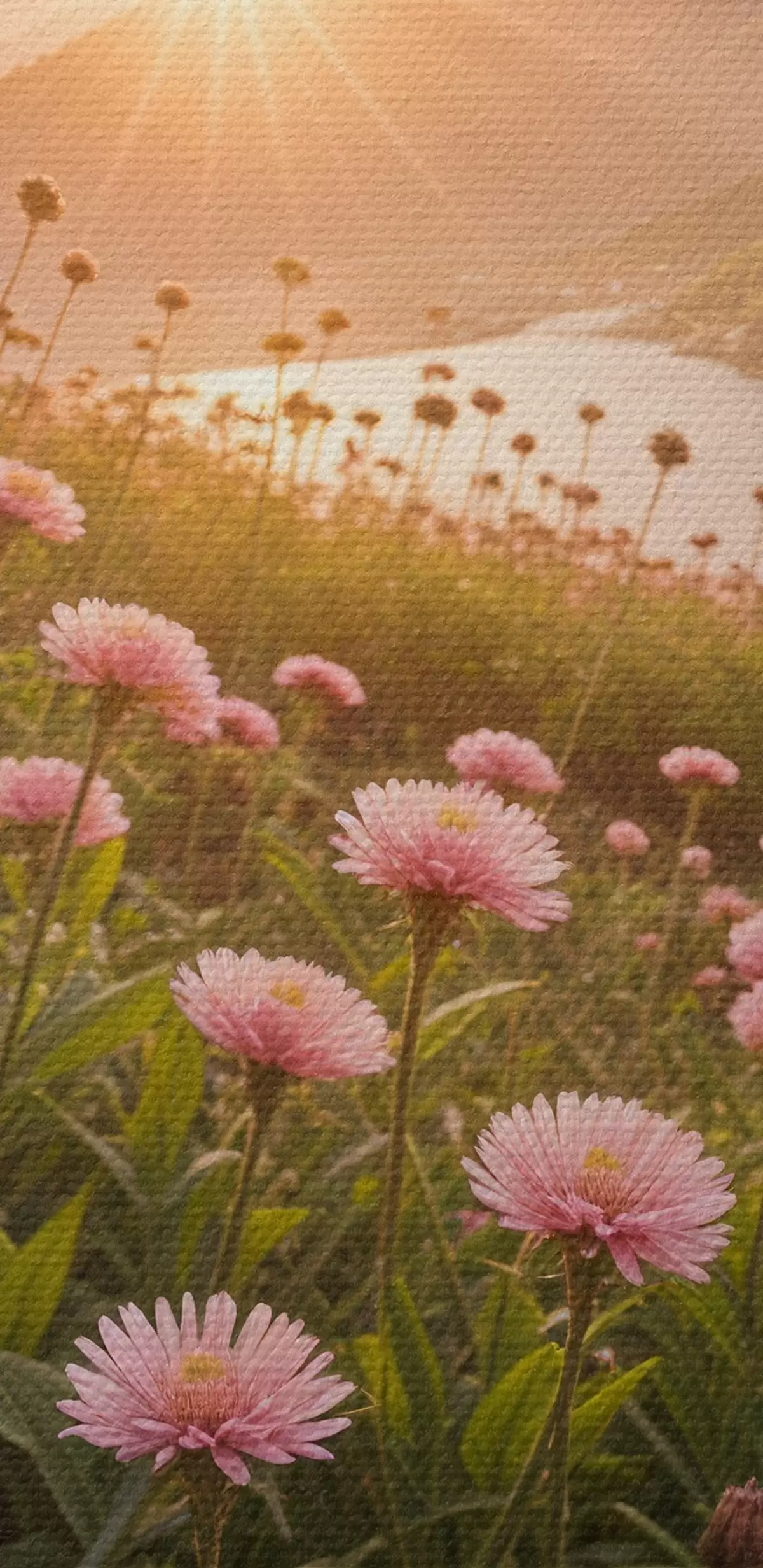 Picturi rotunde Un câmp de flori roz ca margaretele în prim-plan, cu un lanț muntos mare în fundal Nr r40154