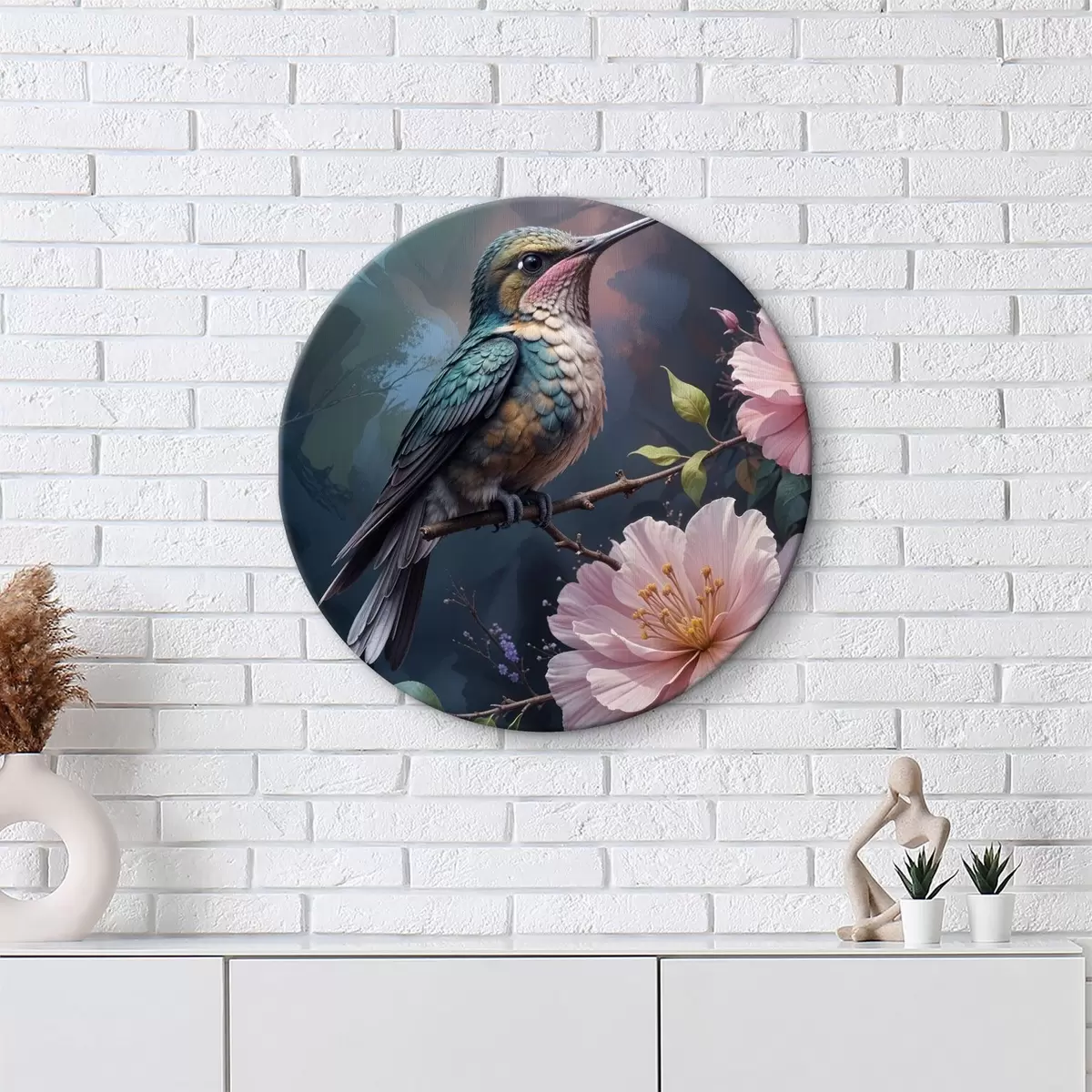 Picturi rotunde O pasăre colibri colorată cocoțată pe o ramură cu flori roz vibrante în fundal Nr r40155