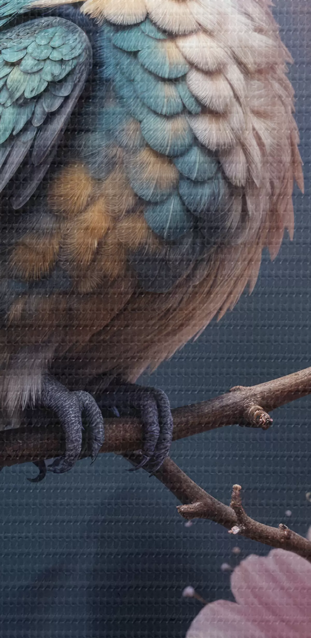 Picturi rotunde O pasăre colibri colorată cocoțată pe o ramură cu flori roz vibrante în fundal r40155
