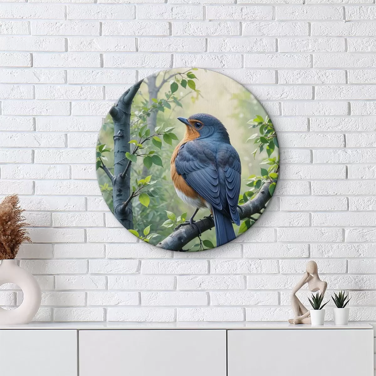 Picturi rotunde Două păsări albastre și portocalii cocoțate pe o ramură de copac cu frunze verzi în fundal r40156
