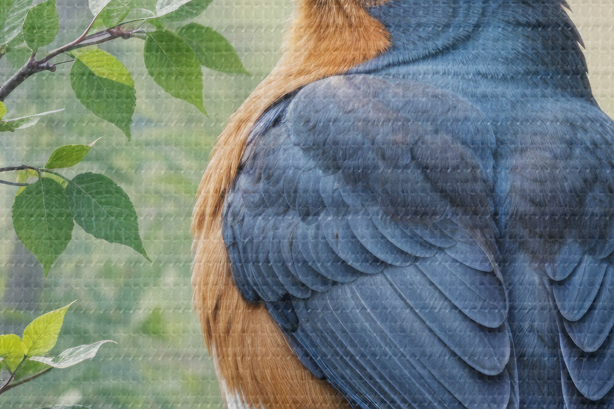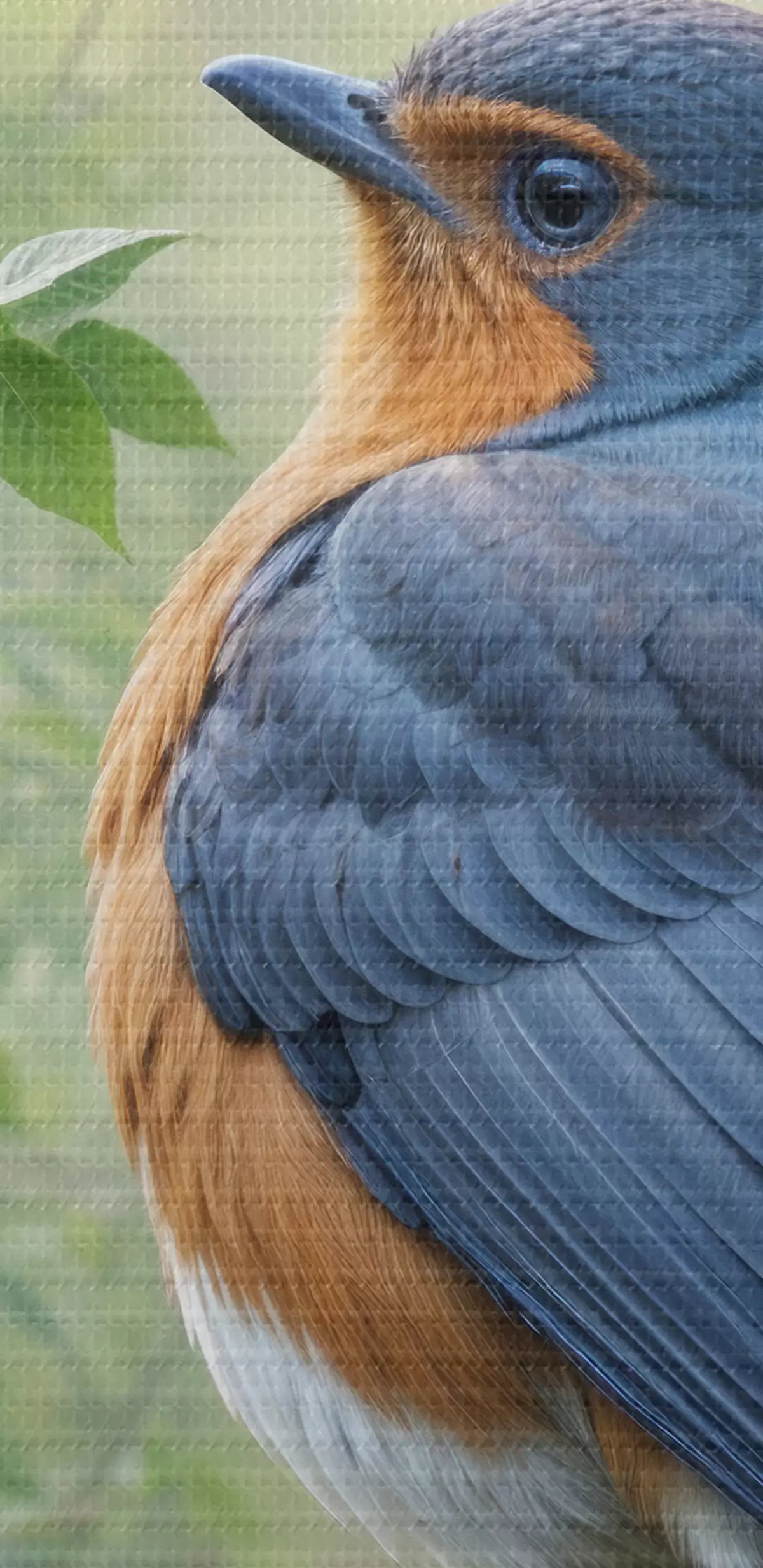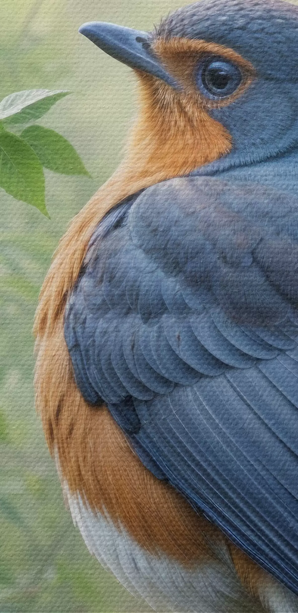 Picturi rotunde Două păsări albastre și portocalii cocoțate pe o ramură de copac cu frunze verzi în fundal Nr r40156