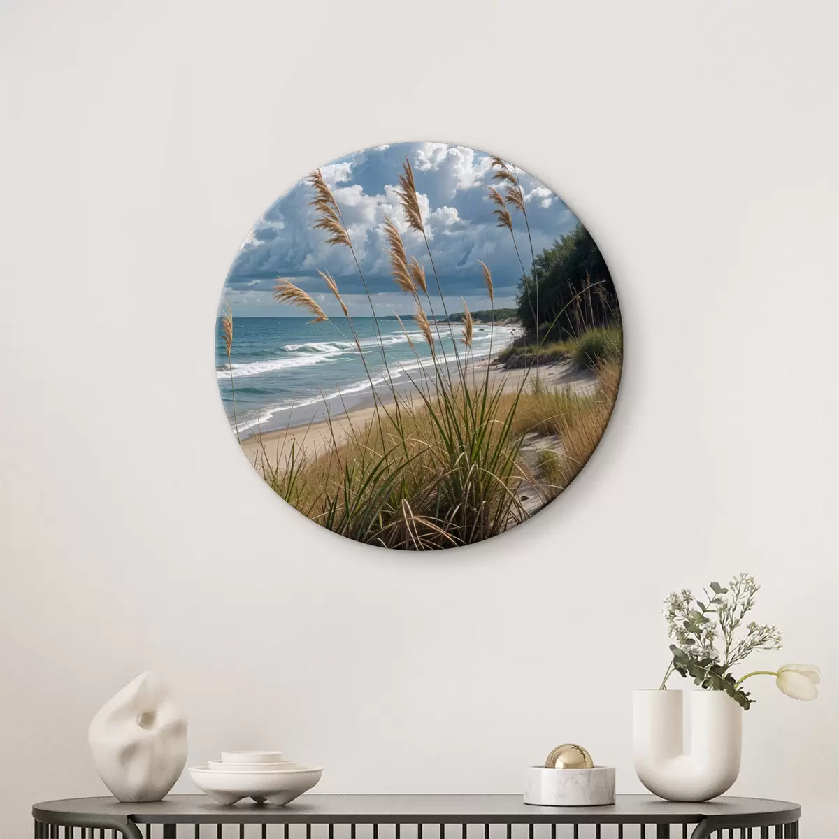 Picturi rotunde O plajă pitorească cu iarbă înaltă legănată de vânt, cu vedere la ocean cu valuri care se sparg și un cer înnorat r40161