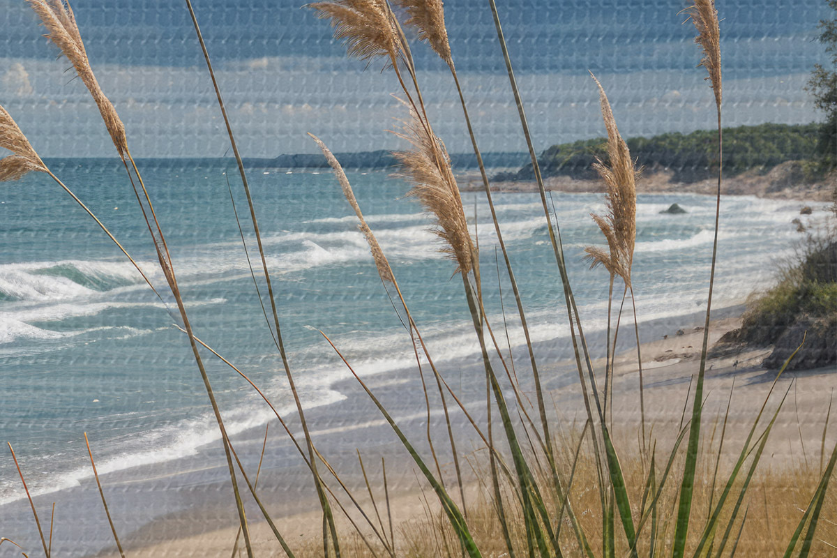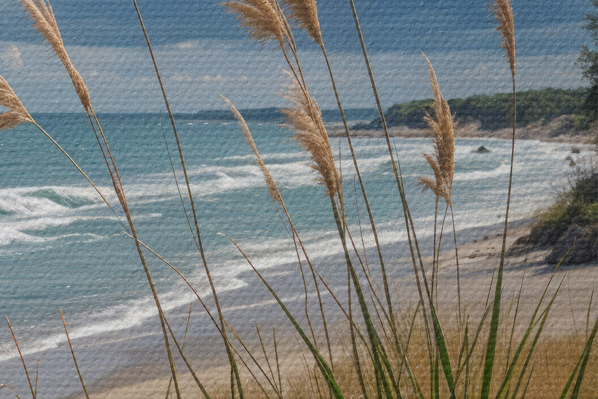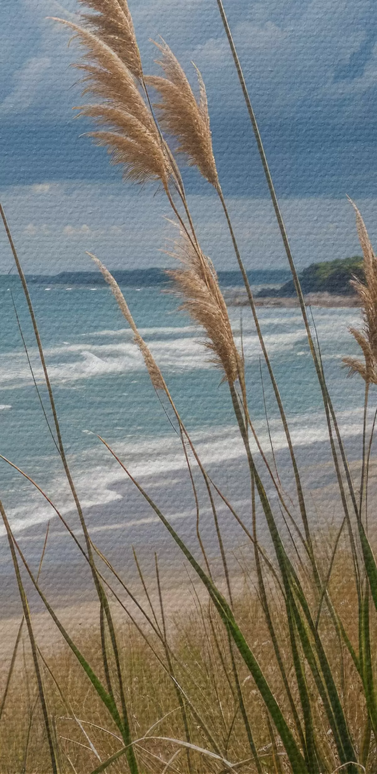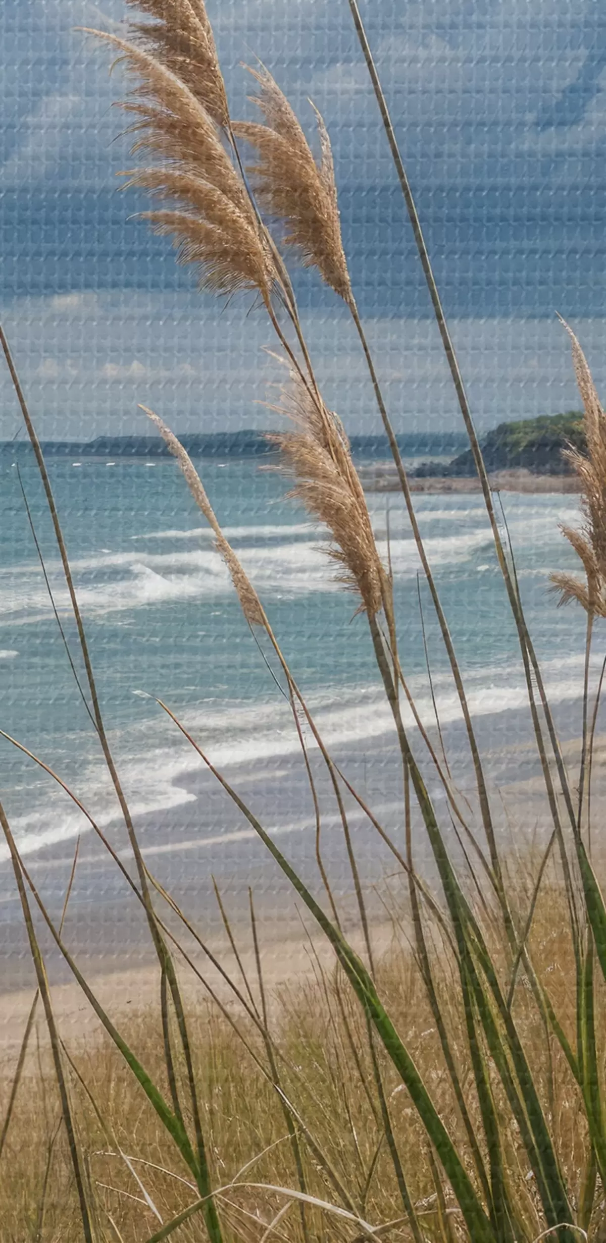 Picturi rotunde O plajă pitorească cu iarbă înaltă legănată de vânt, cu vedere la ocean cu valuri care se sparg și un cer înnorat Nr r40161
