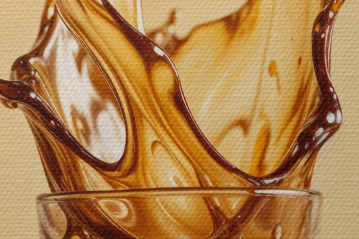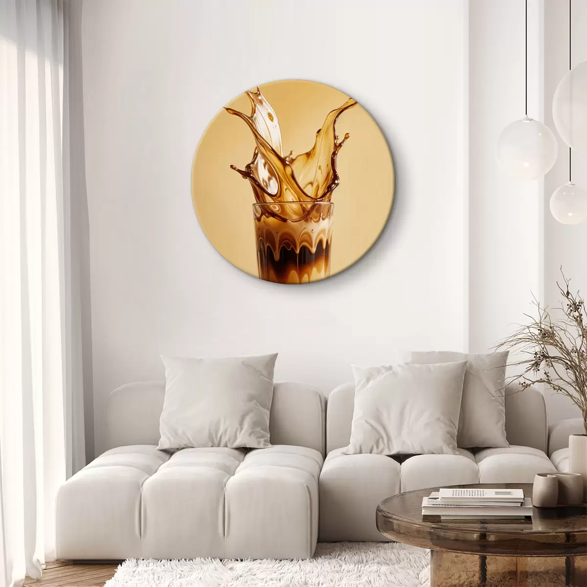 Picturi rotunde Un pahar umplut cu cafea cu un efect dramatic de stropire, creând o imagine abstractă și dinamică Nr r40165