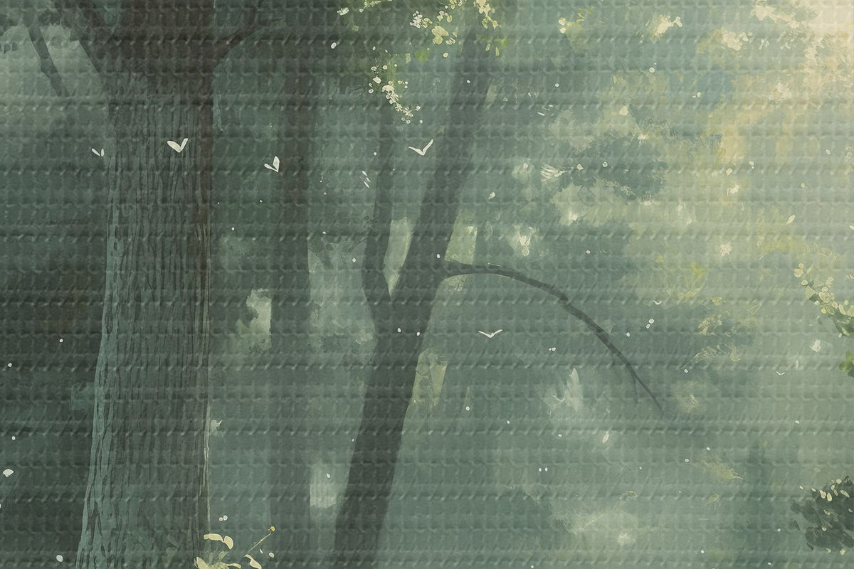 Picturi rotunde Pădure densă cu lumina soarelui în copaci, flori de mușețel, iarbă verde, natură Nr r40224