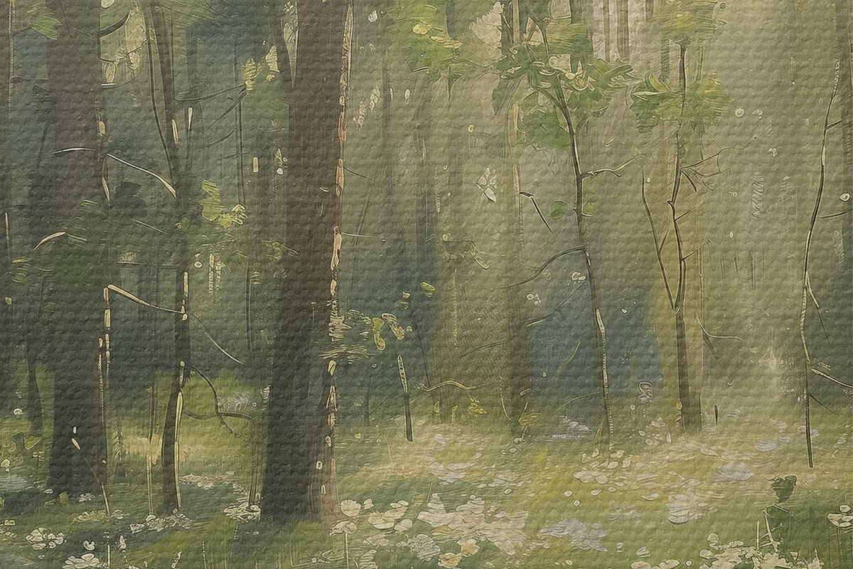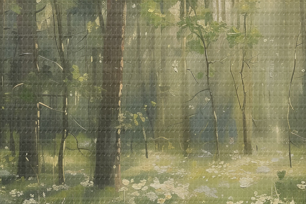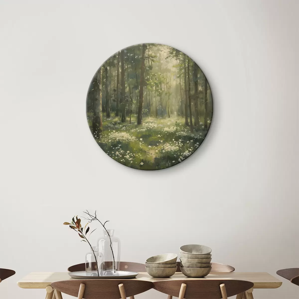 Picturi rotunde Pădure cu lumina soarelui în copaci, flori de mușețel, iarbă verde, desen acrilic Nr r40226