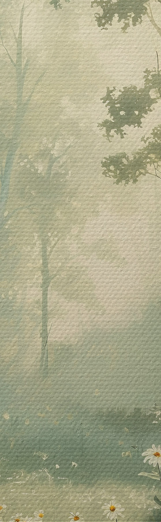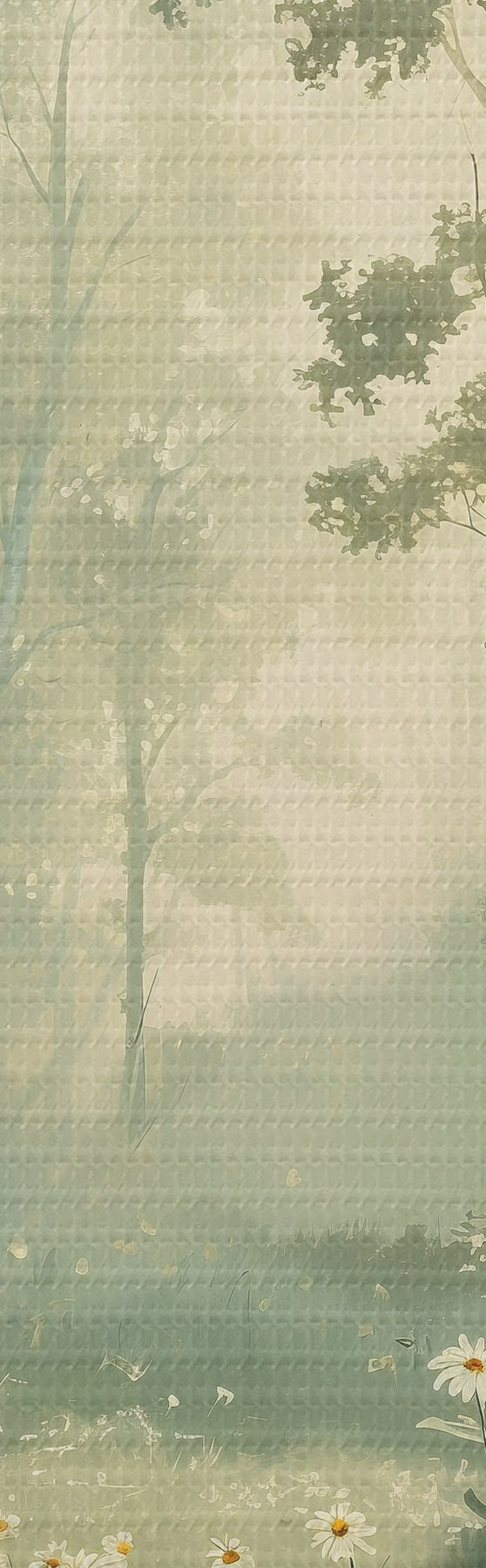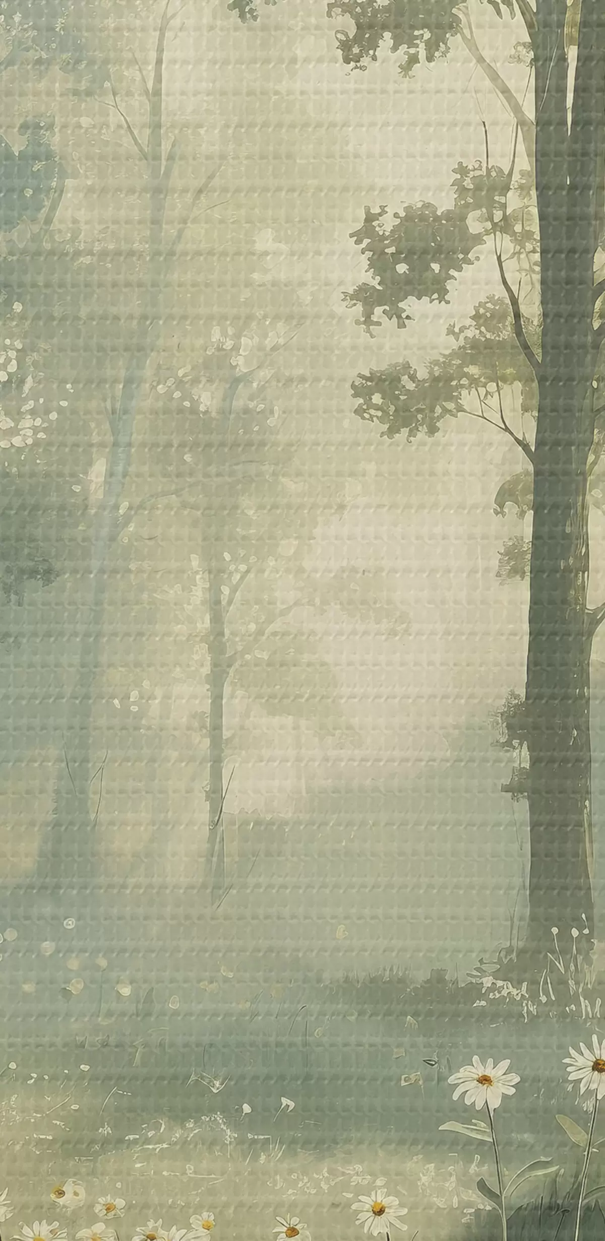 Picturi rotunde Pădure cu lumina soarelui moale, flori de mușețel, copaci, iarbă verde, desen acrilic Nr r40228