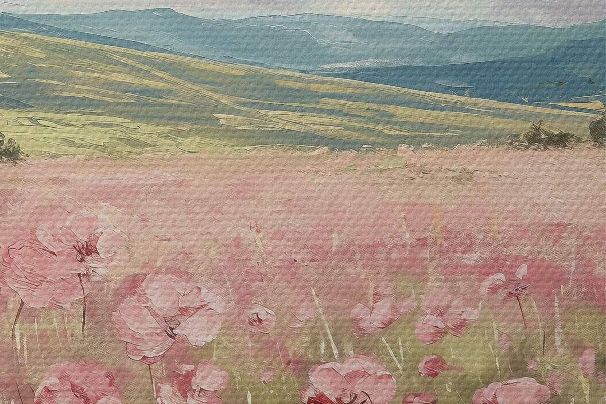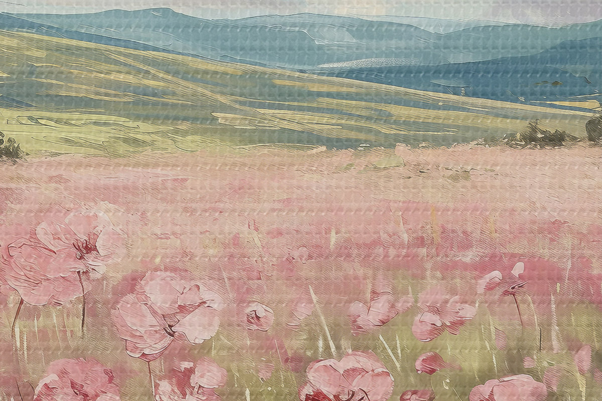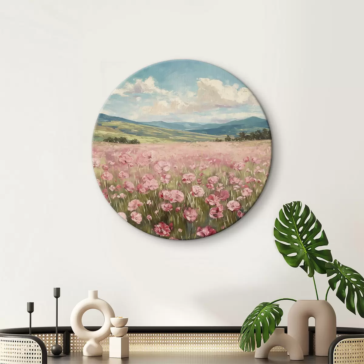 Picturi rotunde Pajiște cu flori roz, munți, peisaj natural, cer albastru cu nori, acrilic Nr r40232