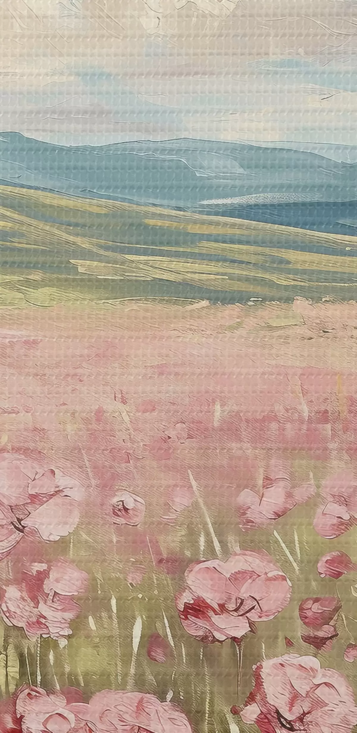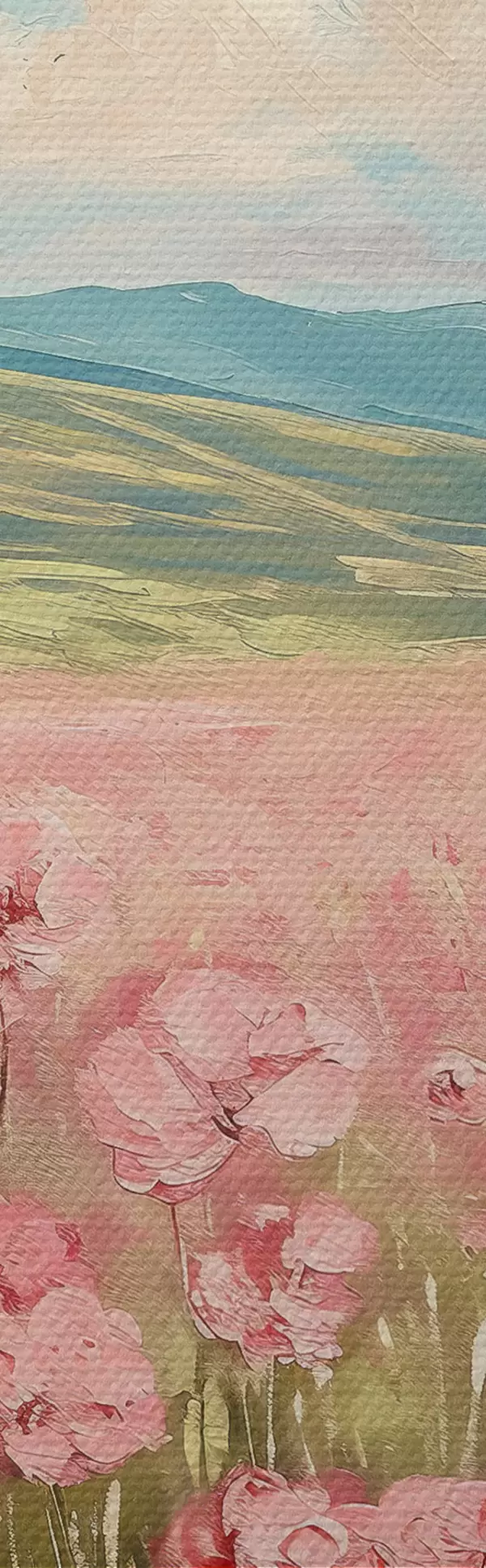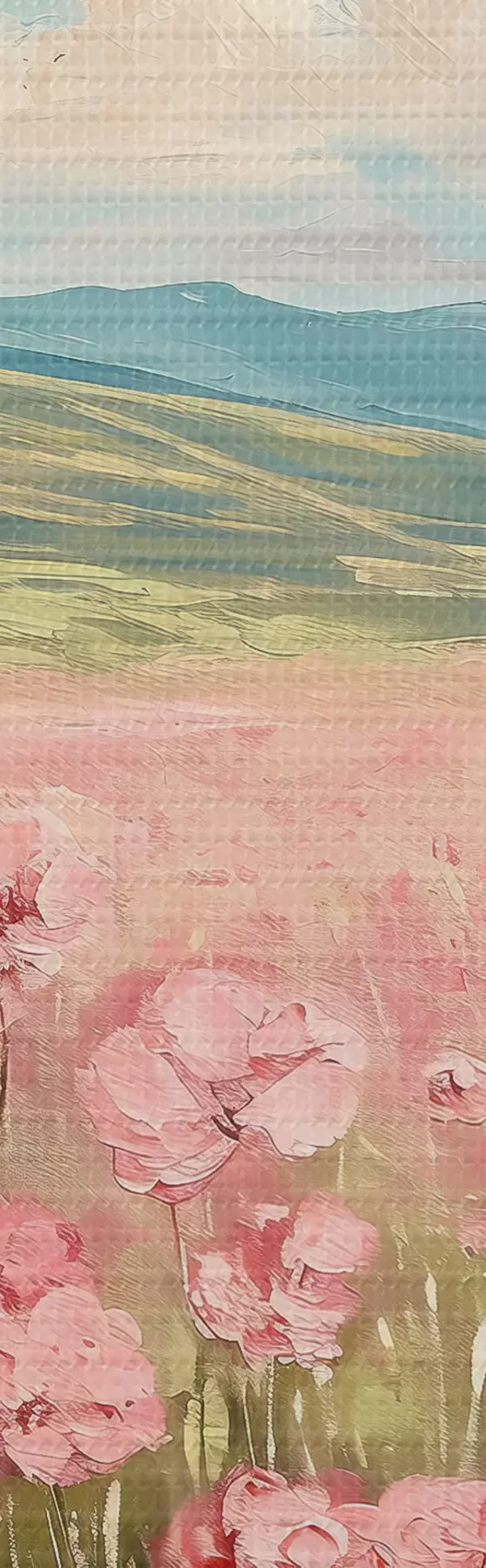 Picturi rotunde Pajiște cu flori roz, munți, peisaj natural, cer albastru cu nori, acrilic Nr r40232