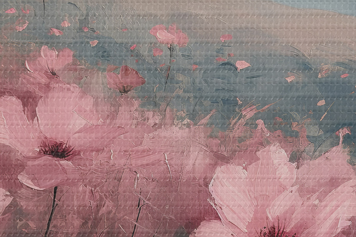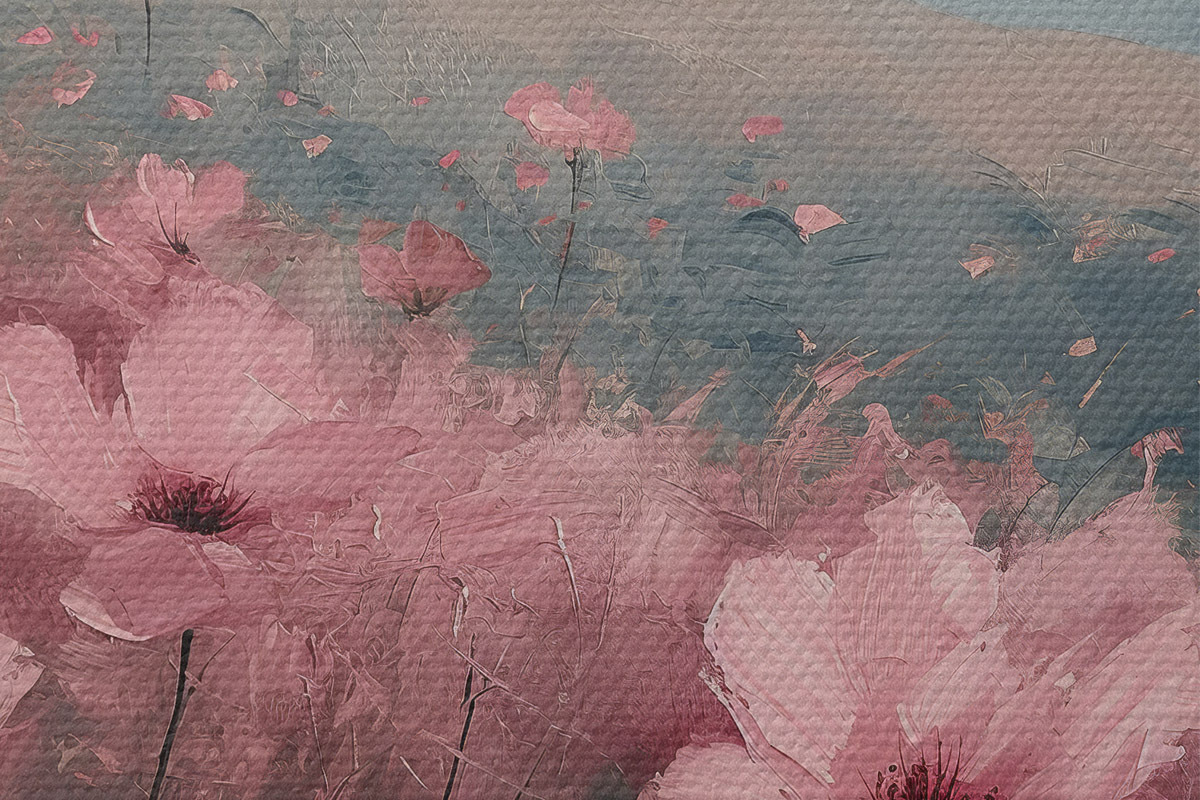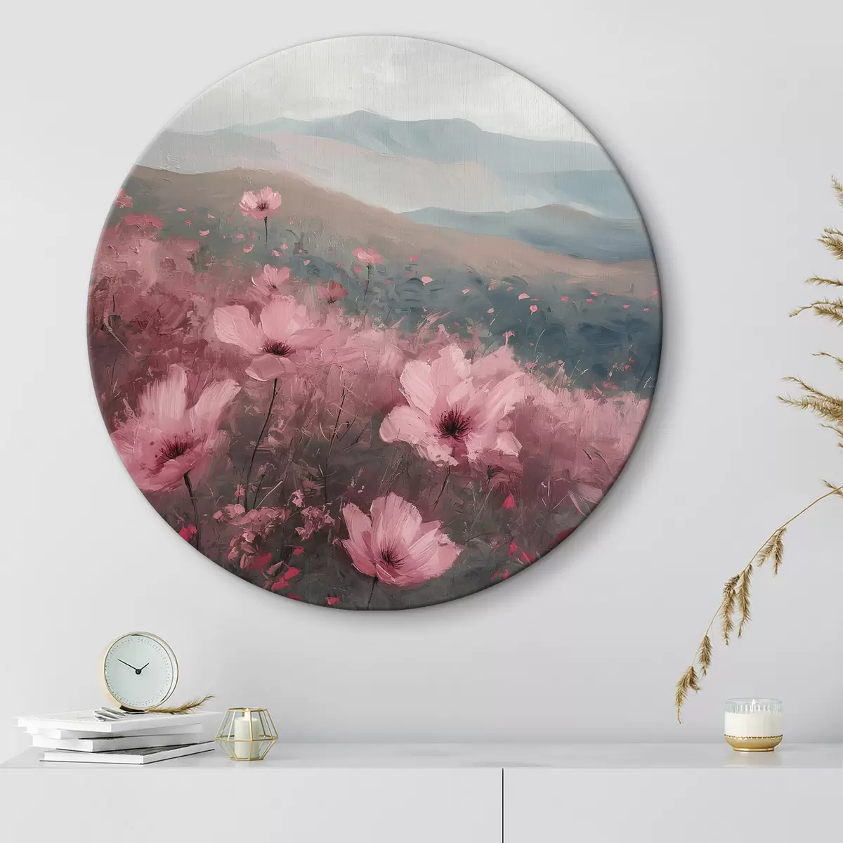 Picturi rotunde Flori roz în pajiște, peisaj natural, munți, pictură în ulei, tușe de perie vii r40233