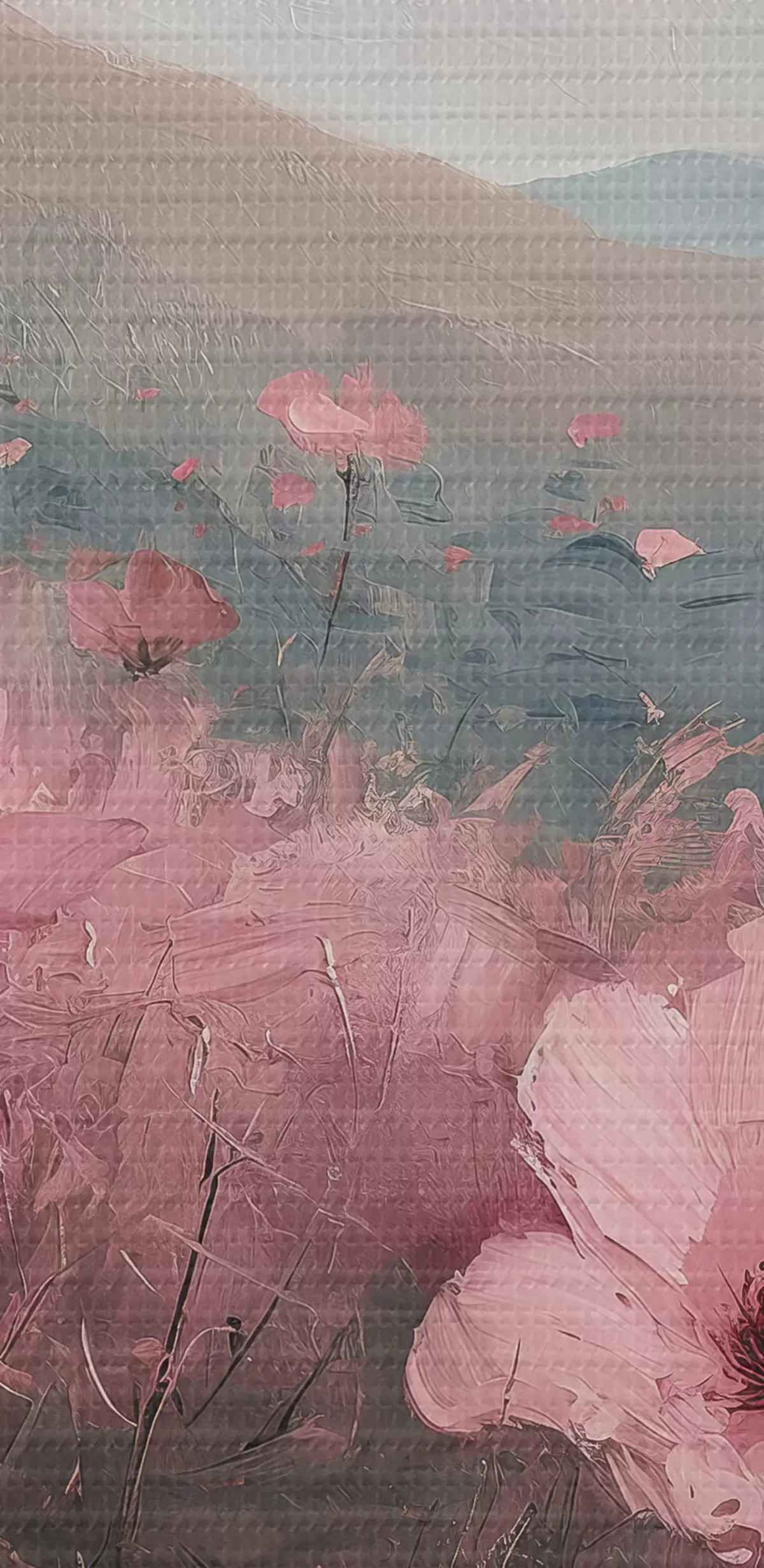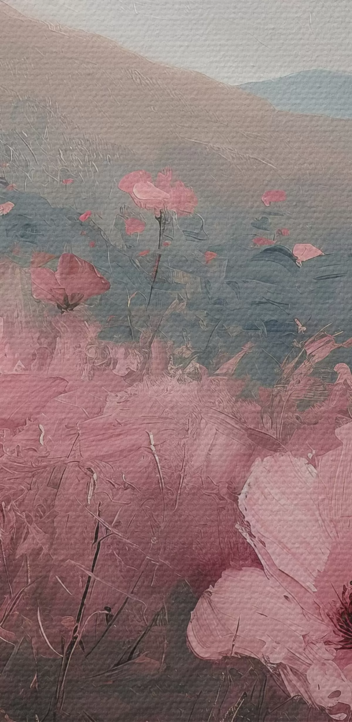 Picturi rotunde Flori roz în pajiște, peisaj natural, munți, pictură în ulei, tușe de perie vii Nr r40233