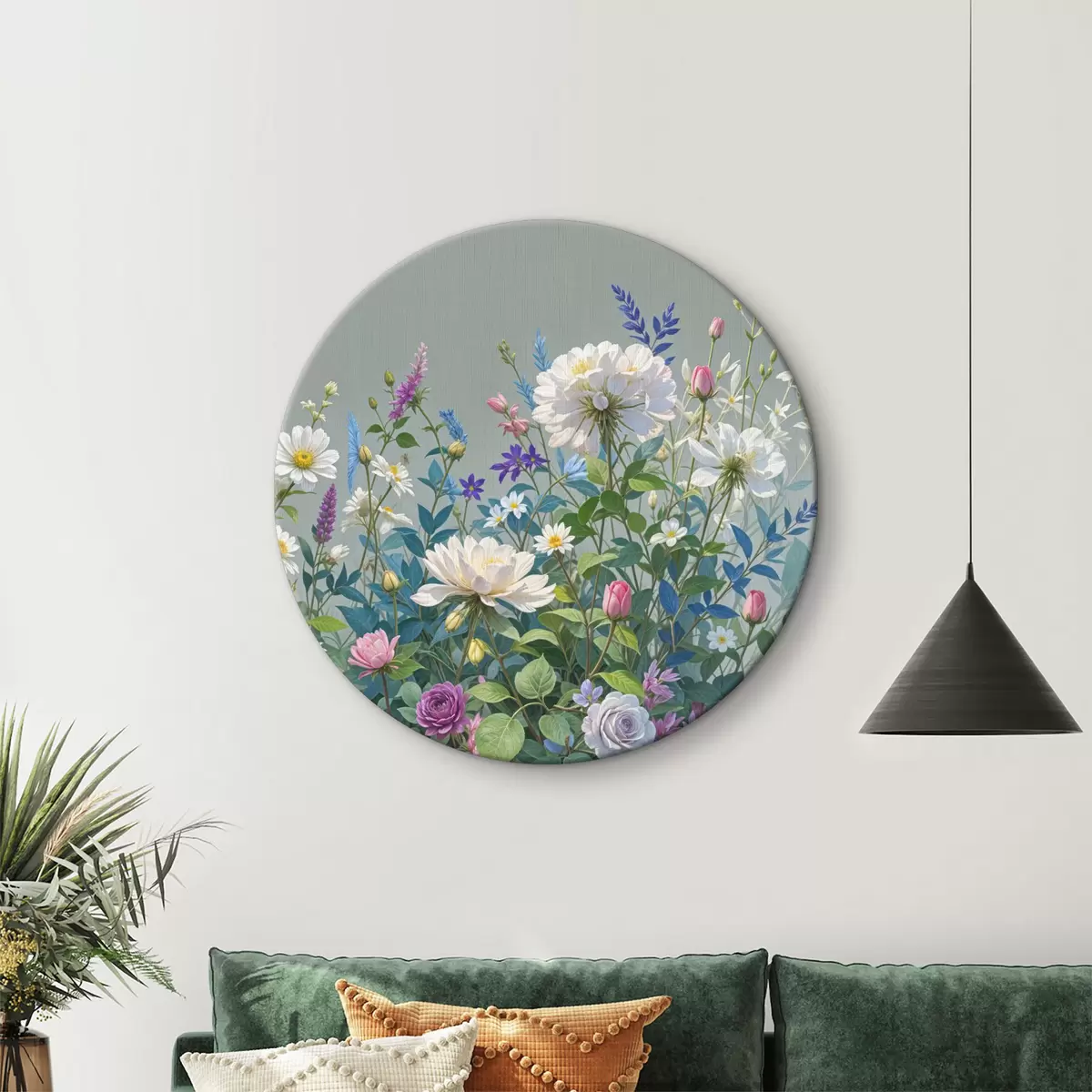 Picturi rotunde O grădină luxuriantă și vibrantă, plină cu o varietate de flori colorate și plante înflorite pe un fundal gri r40393