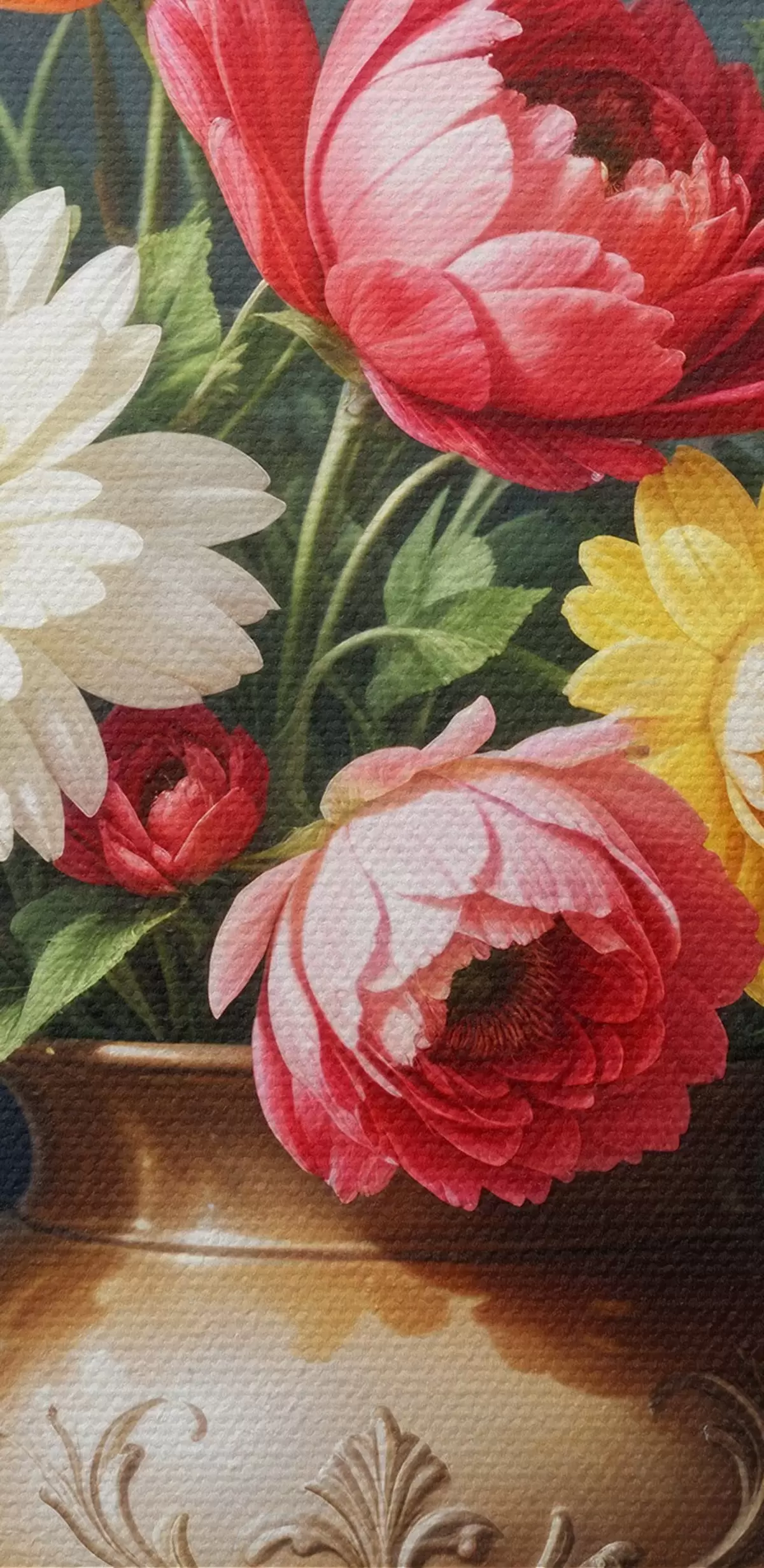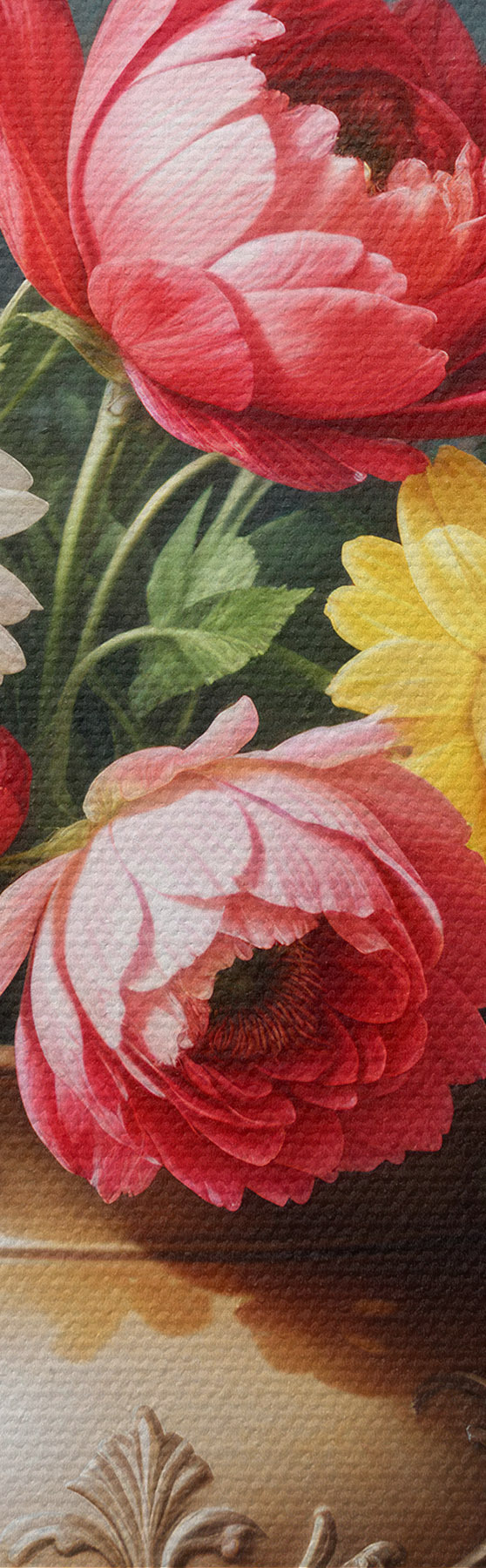 Trei tipuri de materiale sunt disponibile pentru comandă: Economic Canvas - un material dens și durabil pentru imprimarea digitală, identic cu pânza de pictor, suprafață impermeabilă, reproducere realistă a detaliilor, material cu granulație medie. Premium Canvas - textura seamănă cu cea a pânzei unui pictor (fire mici împletite). Reproducere moale, detaliată a imaginii pe o suprafață mată. Eco-Premium - țesătură 100% bumbac de înaltă calitate. Datorită fibrelor naturale de bumbac, materialul este durabil și rezistent la uzură. Reproducere excelentă a culorilor și a detaliilor.