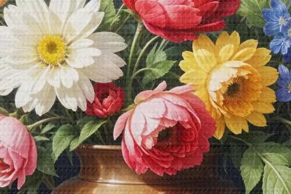 Picturi rotunde O pictură vibrantă a unui buchet de flori colorate, inclusiv trandafiri roșii, narcise galbene și margarete albe Nr r40395