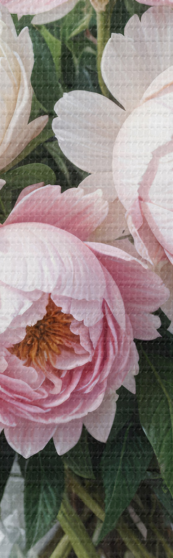 Picturi rotunde Un buchet de bujori frumosi roz si albi intr-o vaza de sticla, dispusi pe o suprafata de lemn Nr r40398