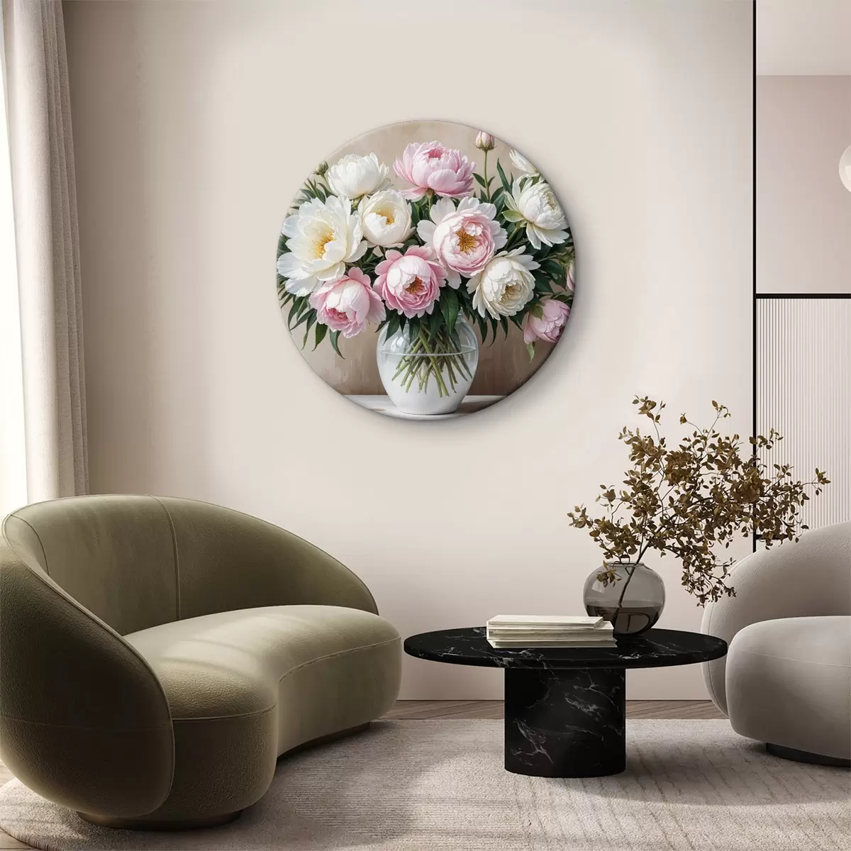 Picturi rotunde Un buchet de bujori frumosi roz si albi intr-o vaza de sticla, dispusi pe o suprafata de lemn r40398