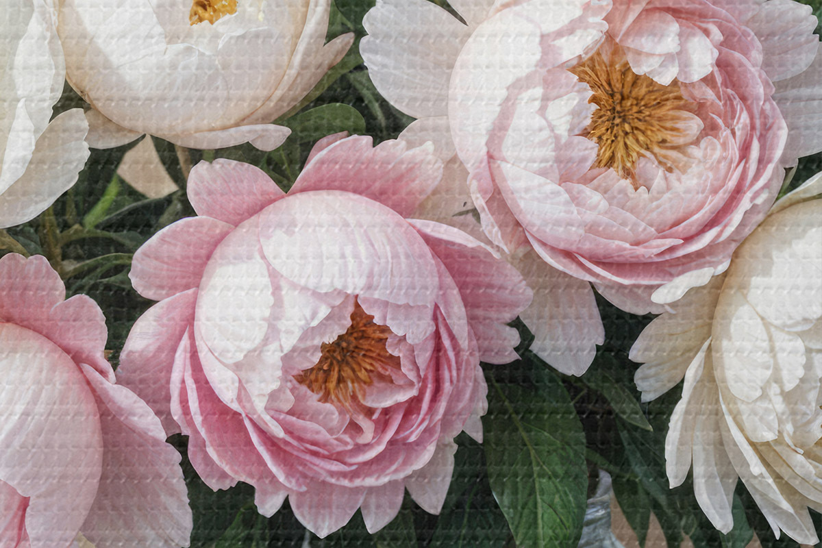 Picturi rotunde Un buchet de bujori frumosi roz si albi intr-o vaza de sticla, dispusi pe o suprafata de lemn Nr r40398