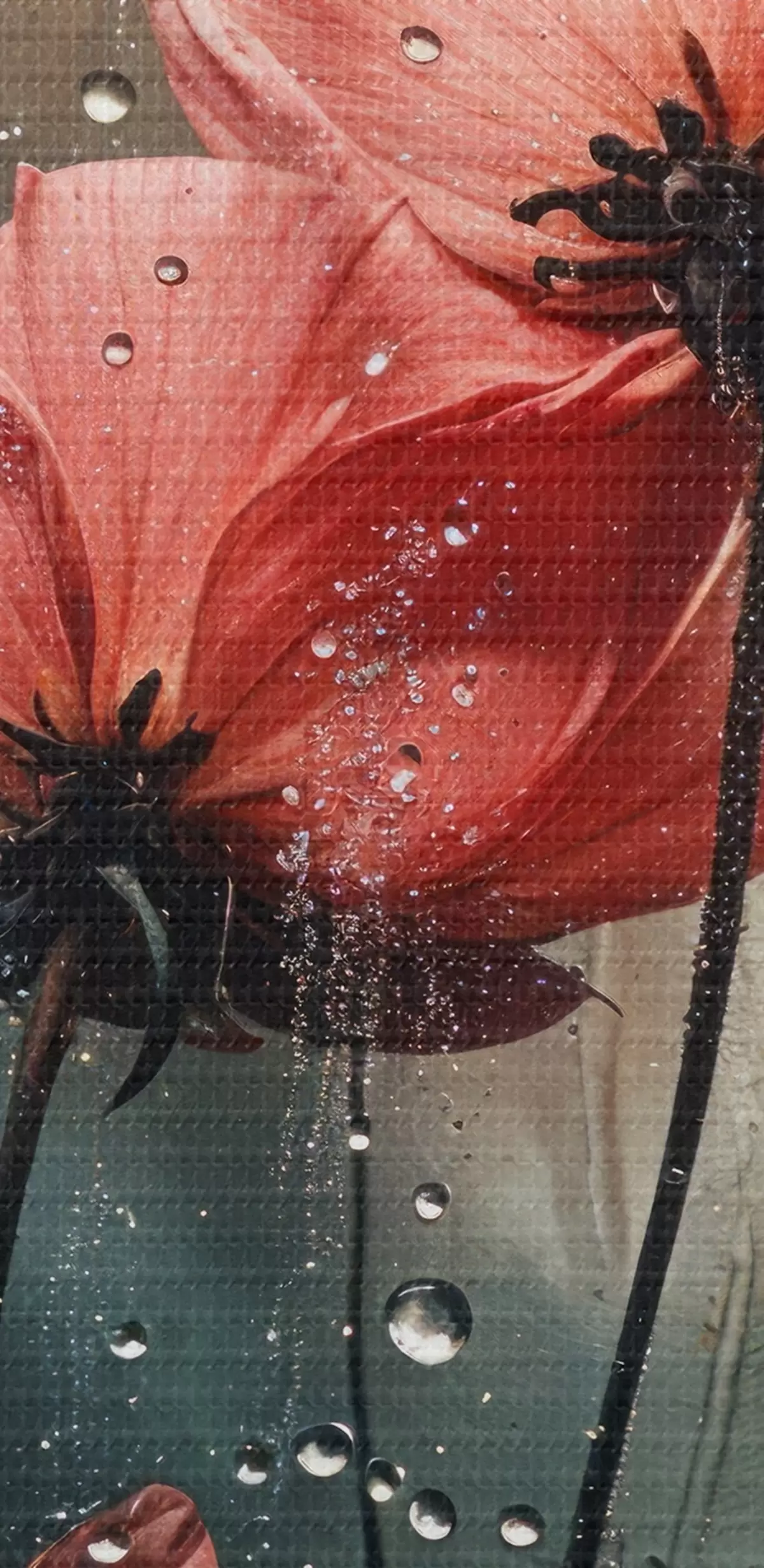 Picturi rotunde Flori roșii cu picături de apă pe un fundal neclar r40412