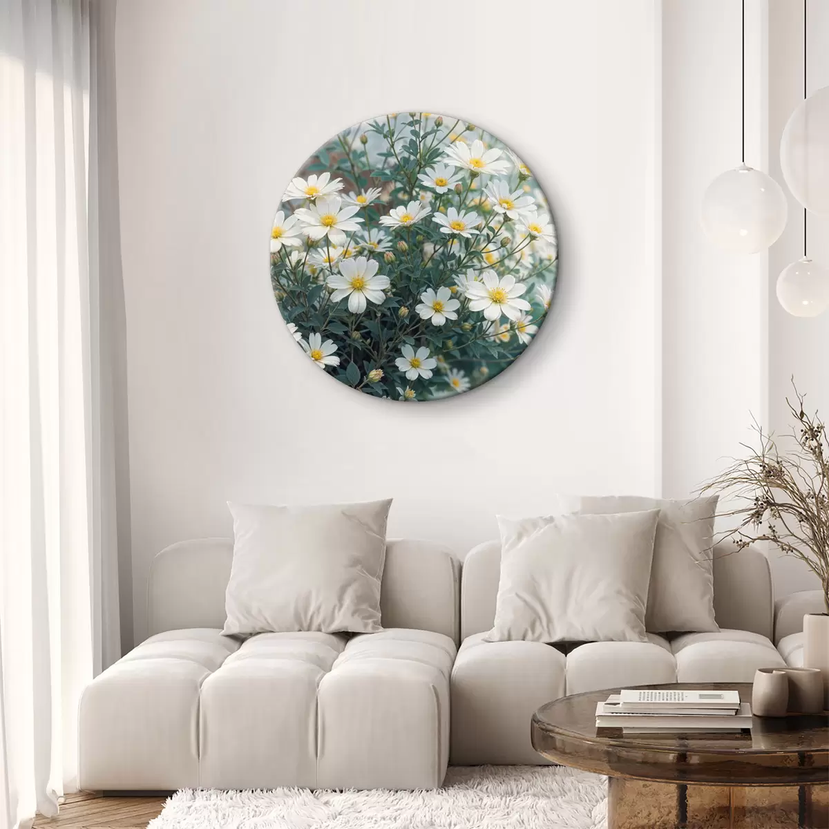 Picturi rotunde Un câmp de flori albe de margarete cu frunziș verde, pe un fundal neclar Nr r40413