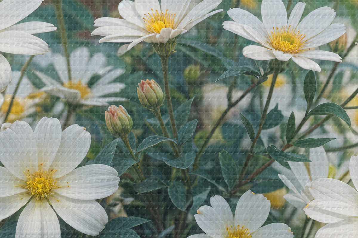 Picturi rotunde Un câmp de flori albe de margarete cu frunziș verde, pe un fundal neclar r40413