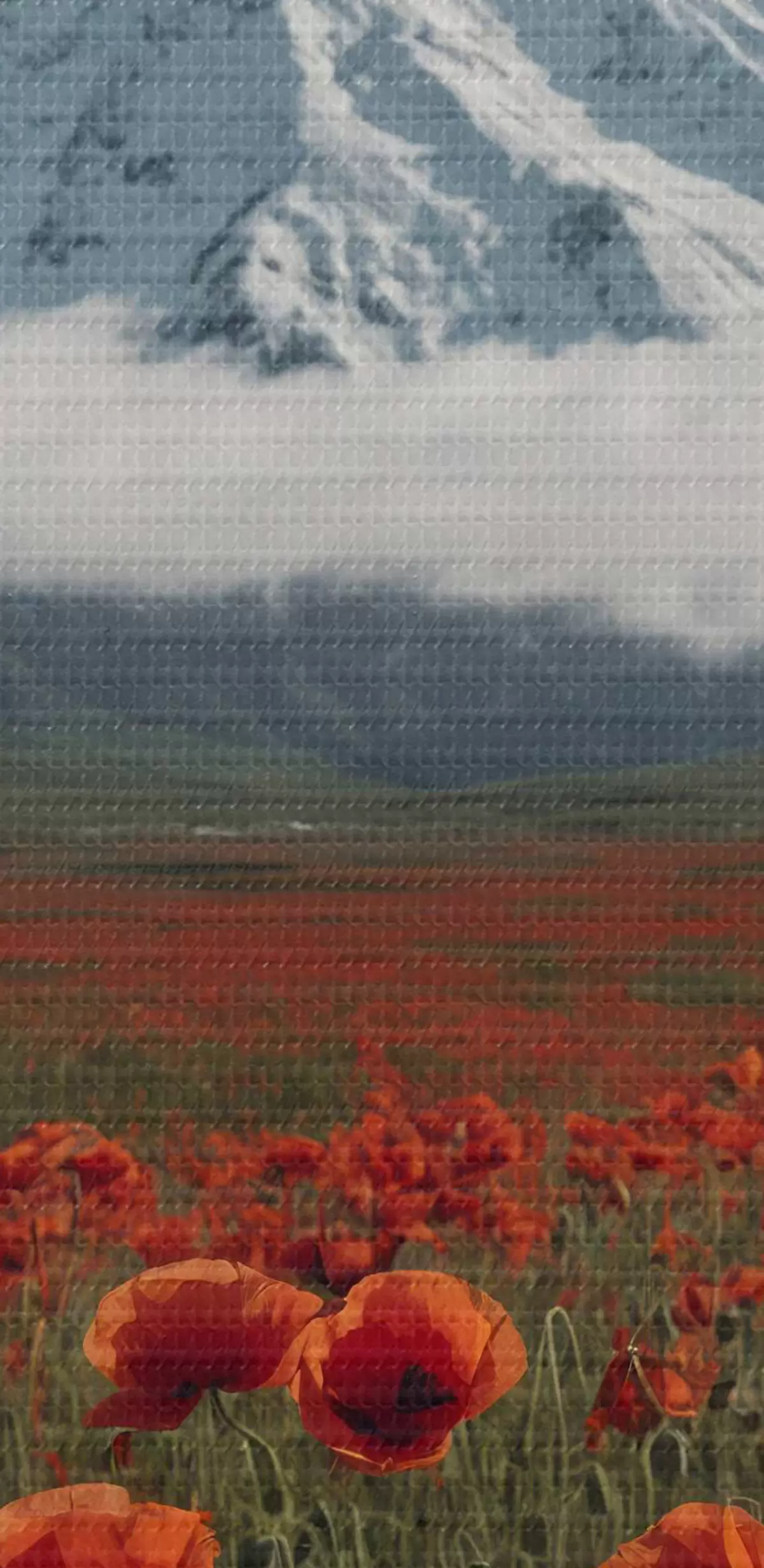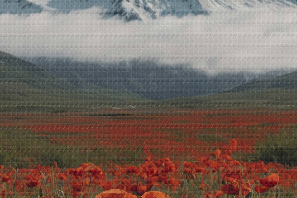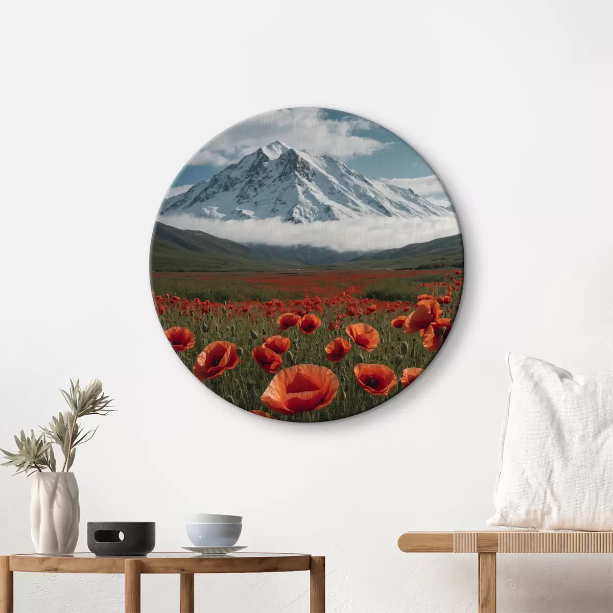 Picturi rotunde Un câmp de maci pe fundalul munților acoperiți de zăpadă Nr r40469