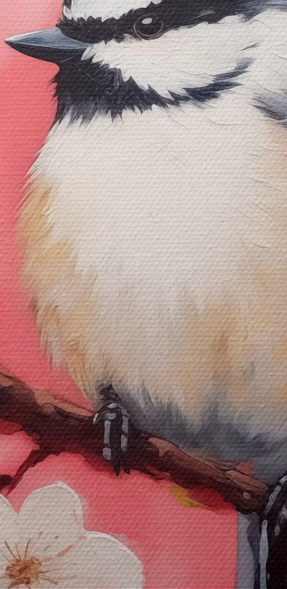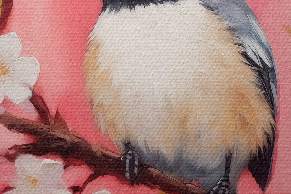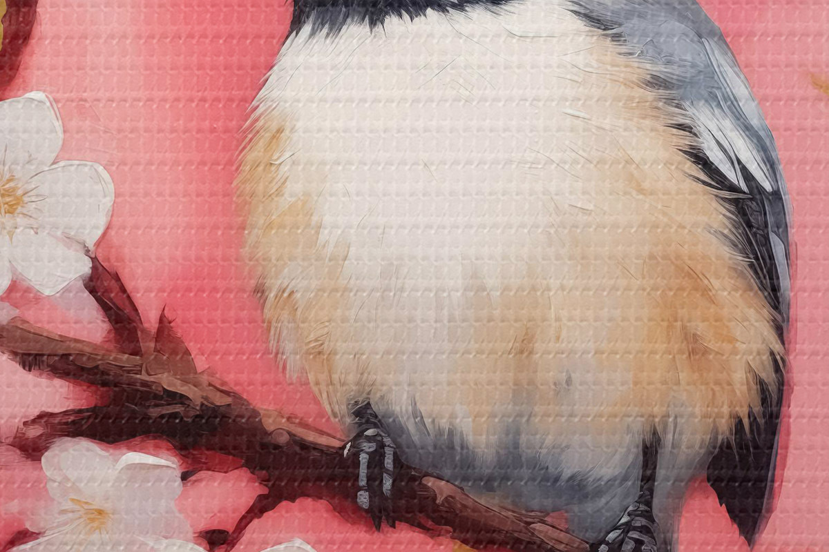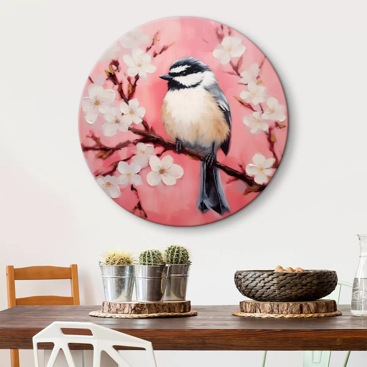 Picturi rotunde Pasărea stă pe o ramură cu flori albe pe un fundal roz Nr r40517