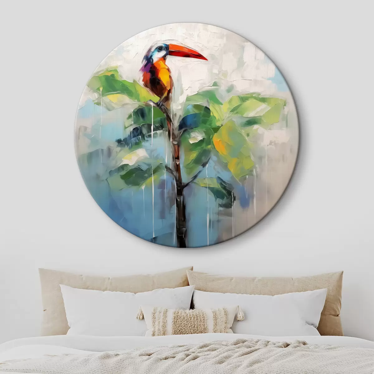 Picturi rotunde Abstract tucan stând pe palmier banane, verde, albastru, gri, galben, rosu culoare Nr r40518