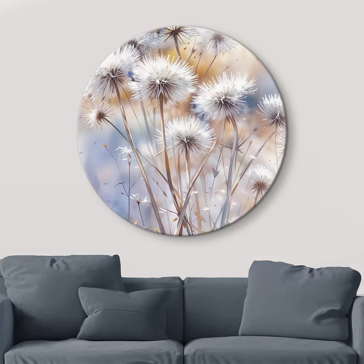 Picturi rotunde Flori albe pufoase de păpădie pe un fundal neclar de acuarelă cu iluminare caldă r40541