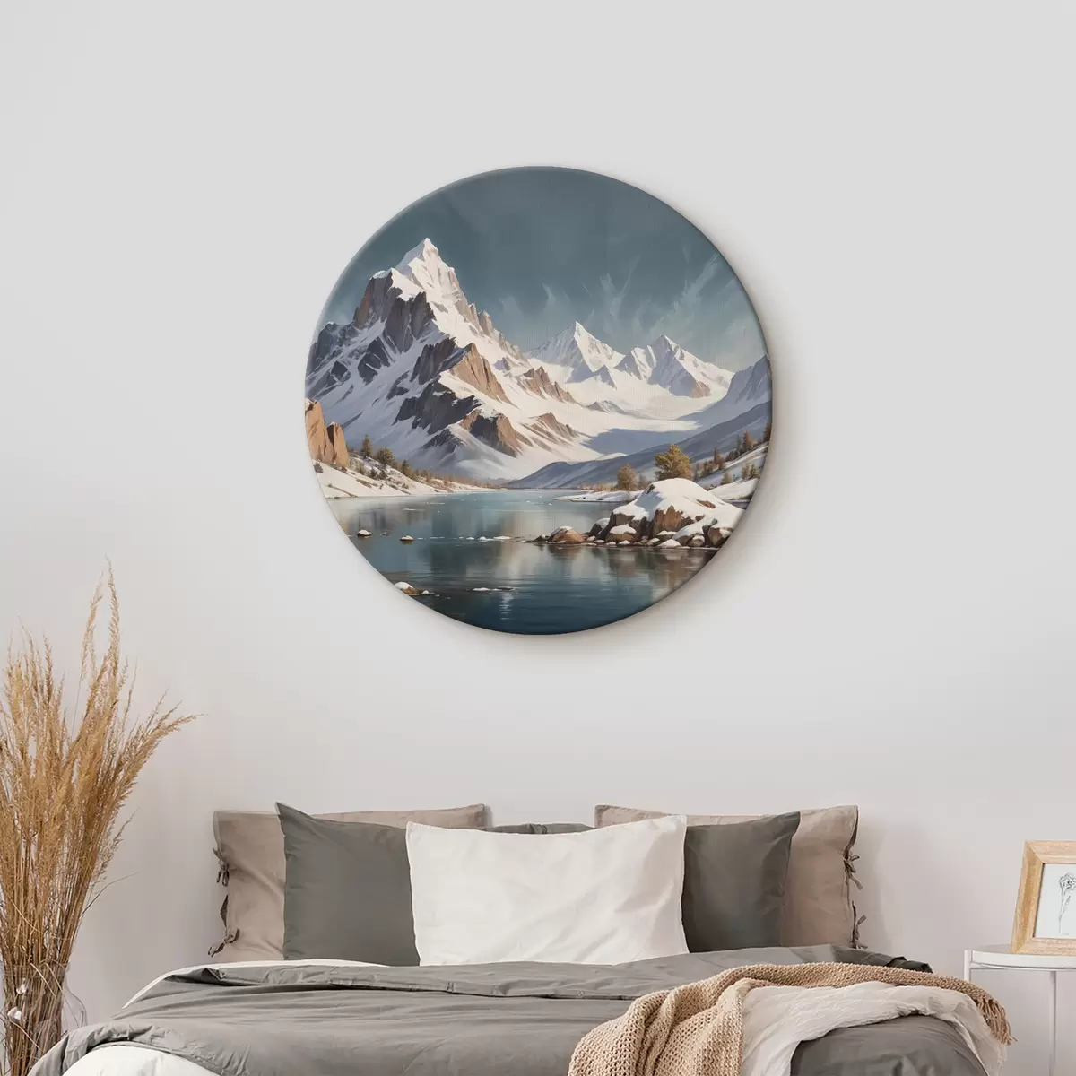 Picturi rotunde Un lanț muntos înzăpezit reflectat într-un lac calm, cu bărci plutind pe apă și un cer înnorat dramatic Nr r40551