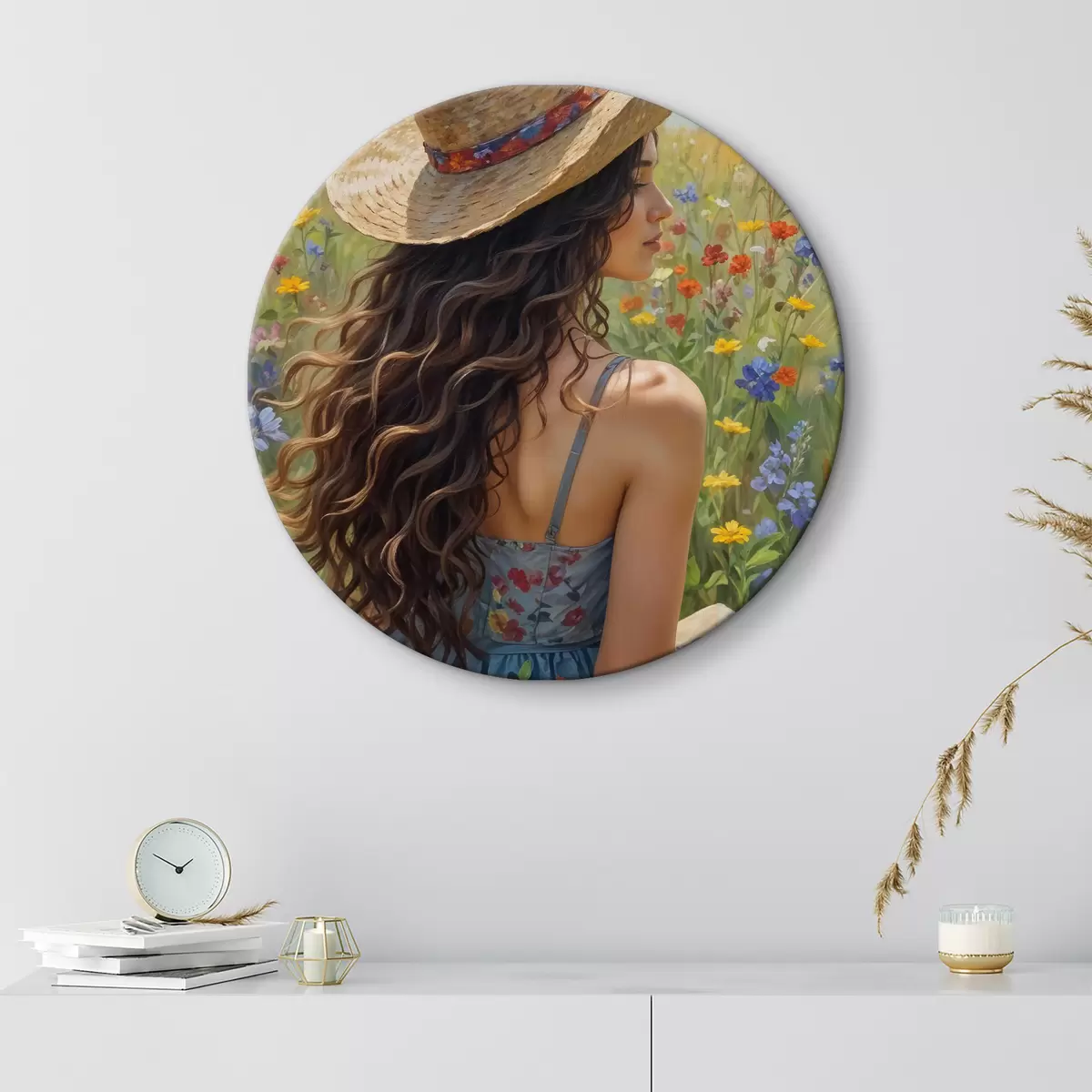 Picturi rotunde Femeie tânără cu părul creț, purtând o pălărie de paie și o rochie cu flori, în picioare într-un câmp de flori sălbatice Nr r40560