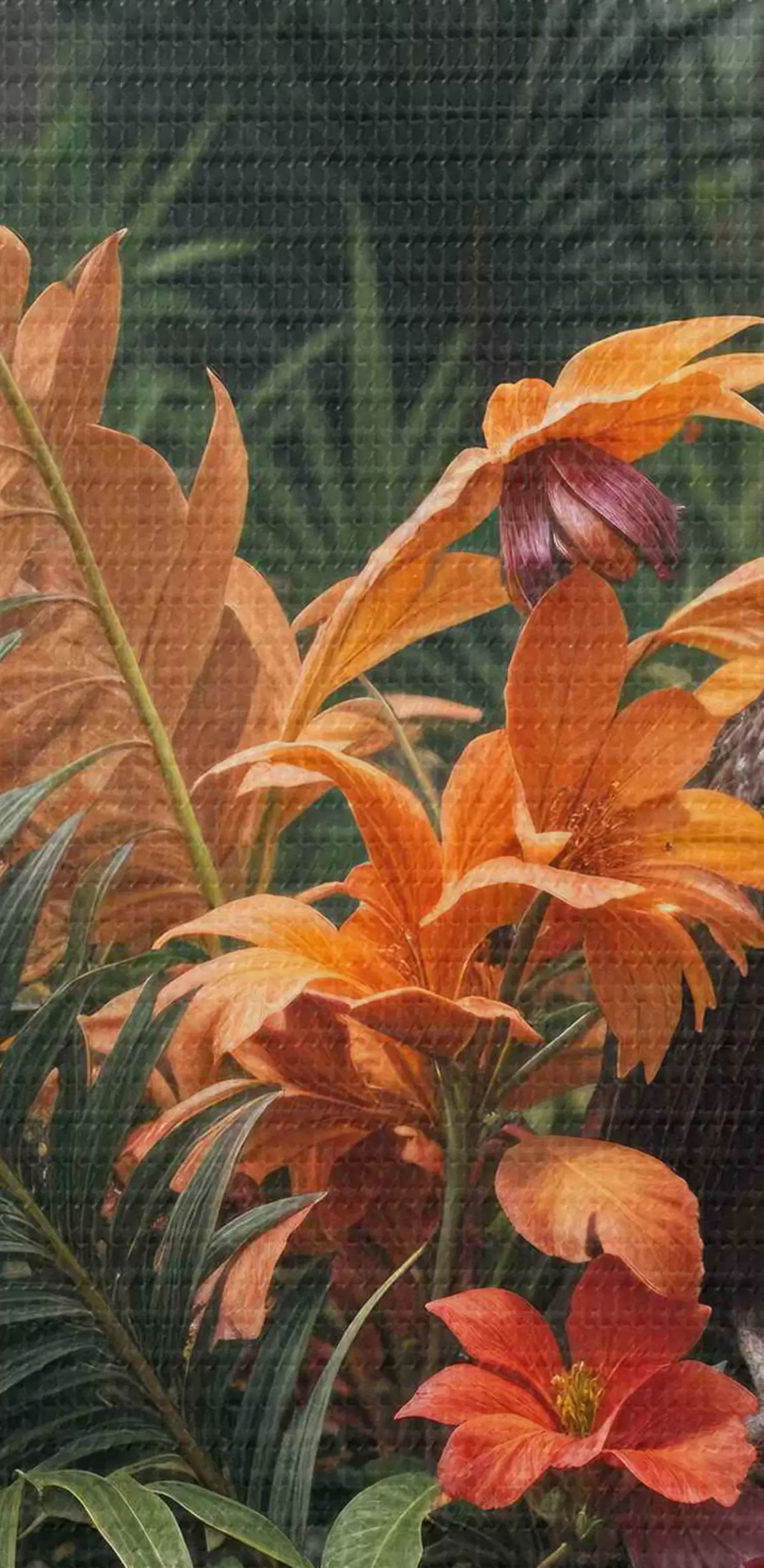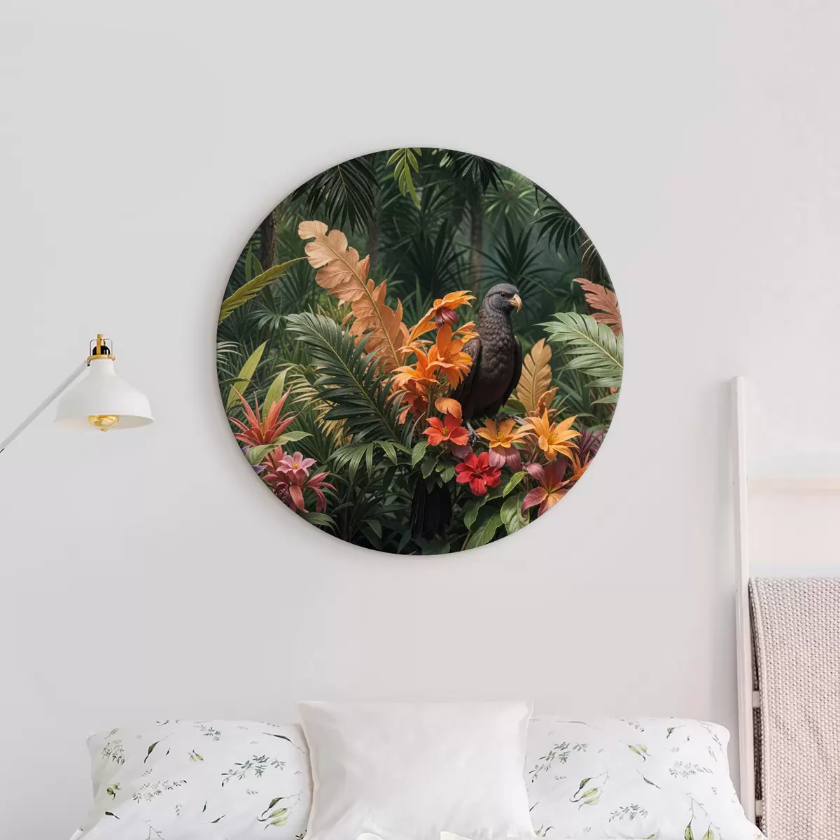 Picturi rotunde Pasăre tropicală așezată pe o ramură înconjurată de vegetație luxuriantă, frunze de palmier, flori și plante exotice Nr r40578