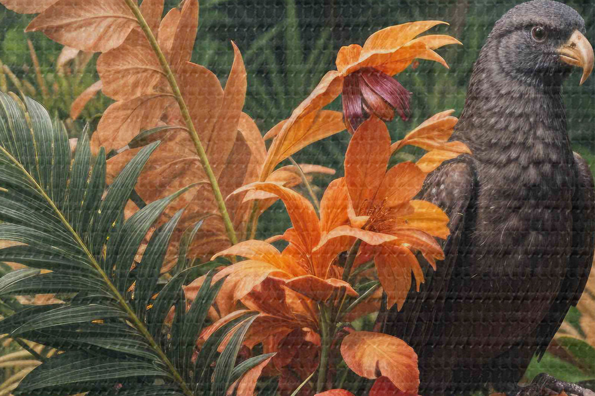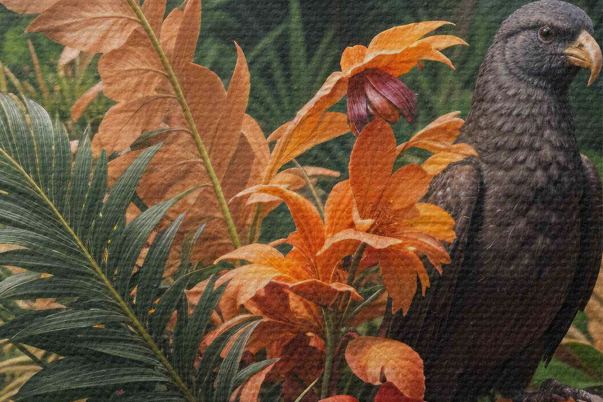 Picturi rotunde Pasăre tropicală așezată pe o ramură înconjurată de vegetație luxuriantă, frunze de palmier, flori și plante exotice r40578