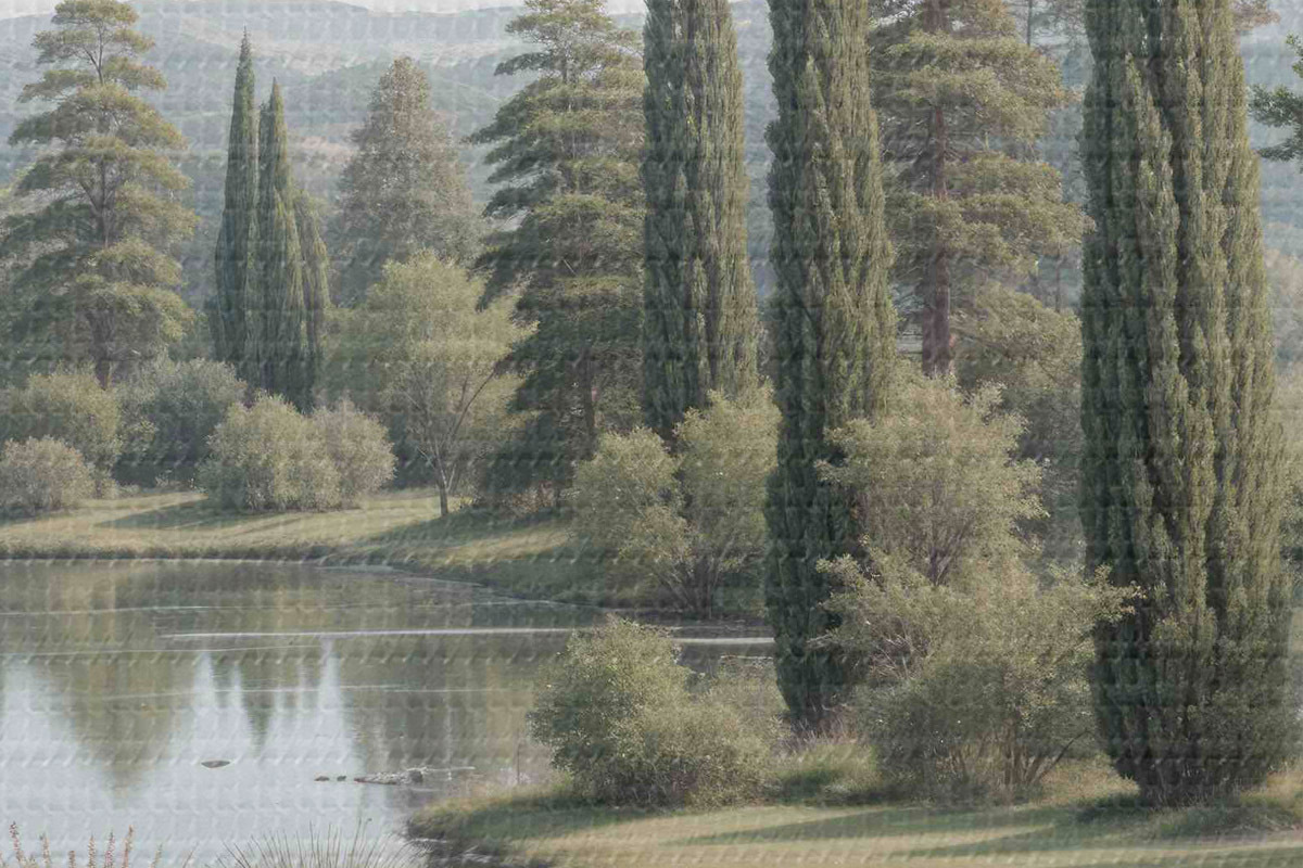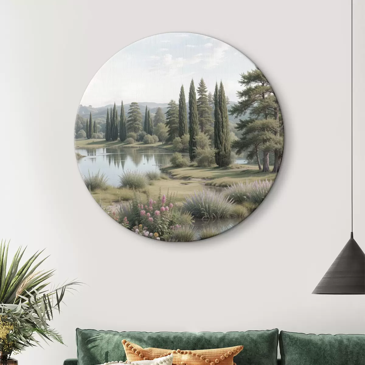 Picturi rotunde Un peisaj liniștit cu un lac liniștit înconjurat de pini, chiparoși și altă vegetație luxuriantă Nr r40579