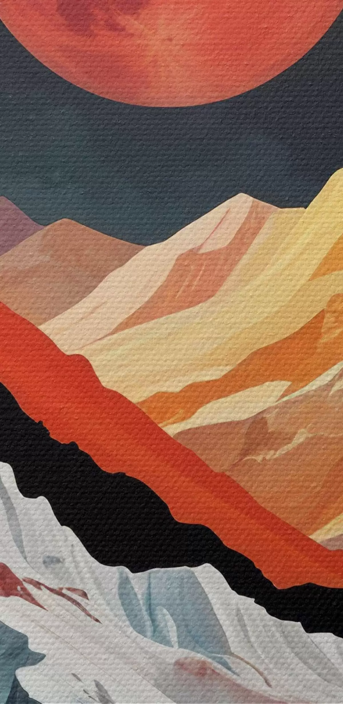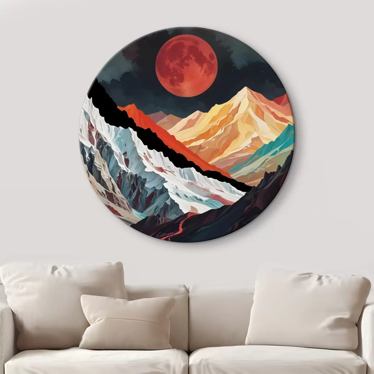 Picturi rotunde Peisaj suprarealist cu munți înalți și zimțați sub o lună mare roșie strălucitoare pe un cer întunecat și noros Nr r40589