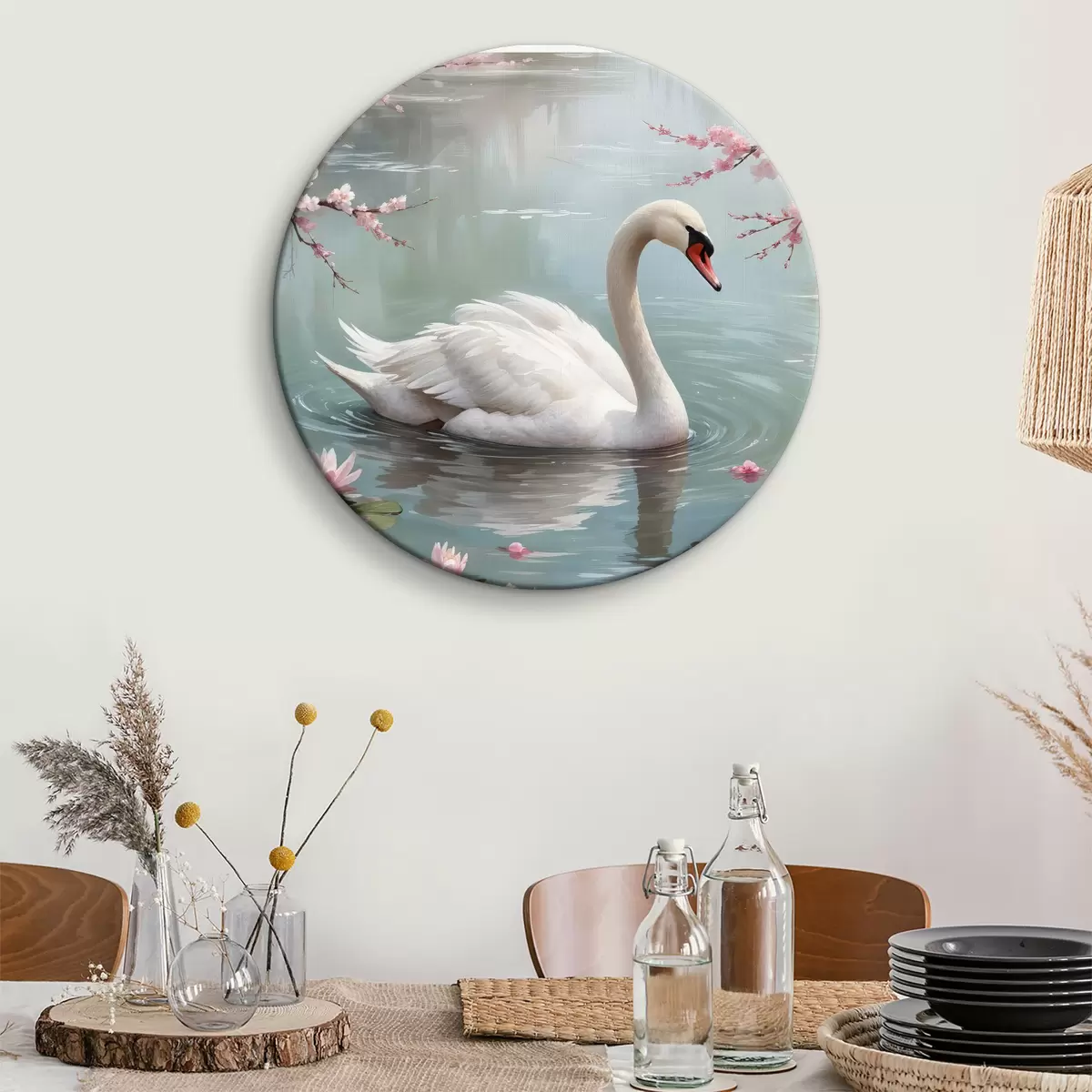 Picturi rotunde Lebădă albă grațioasă înotând într-un iaz calm înconjurat de cireși roz înfloritori Nr r40597