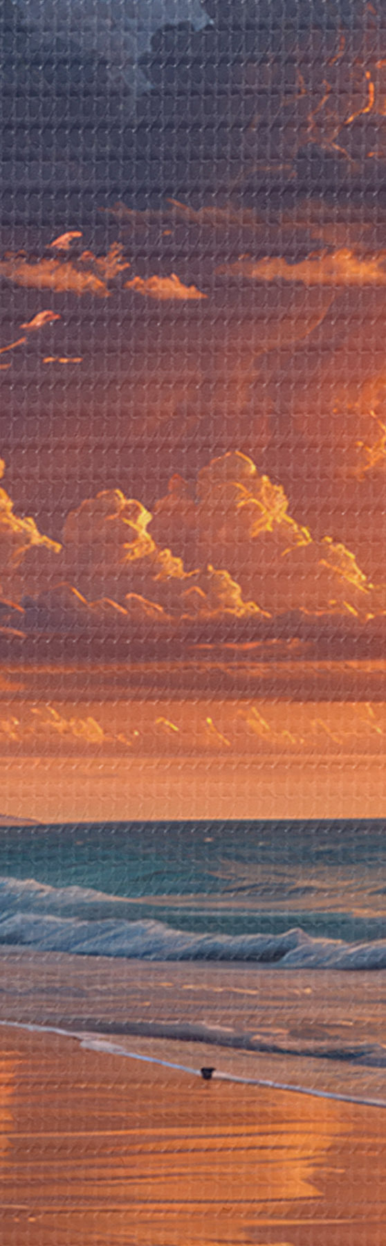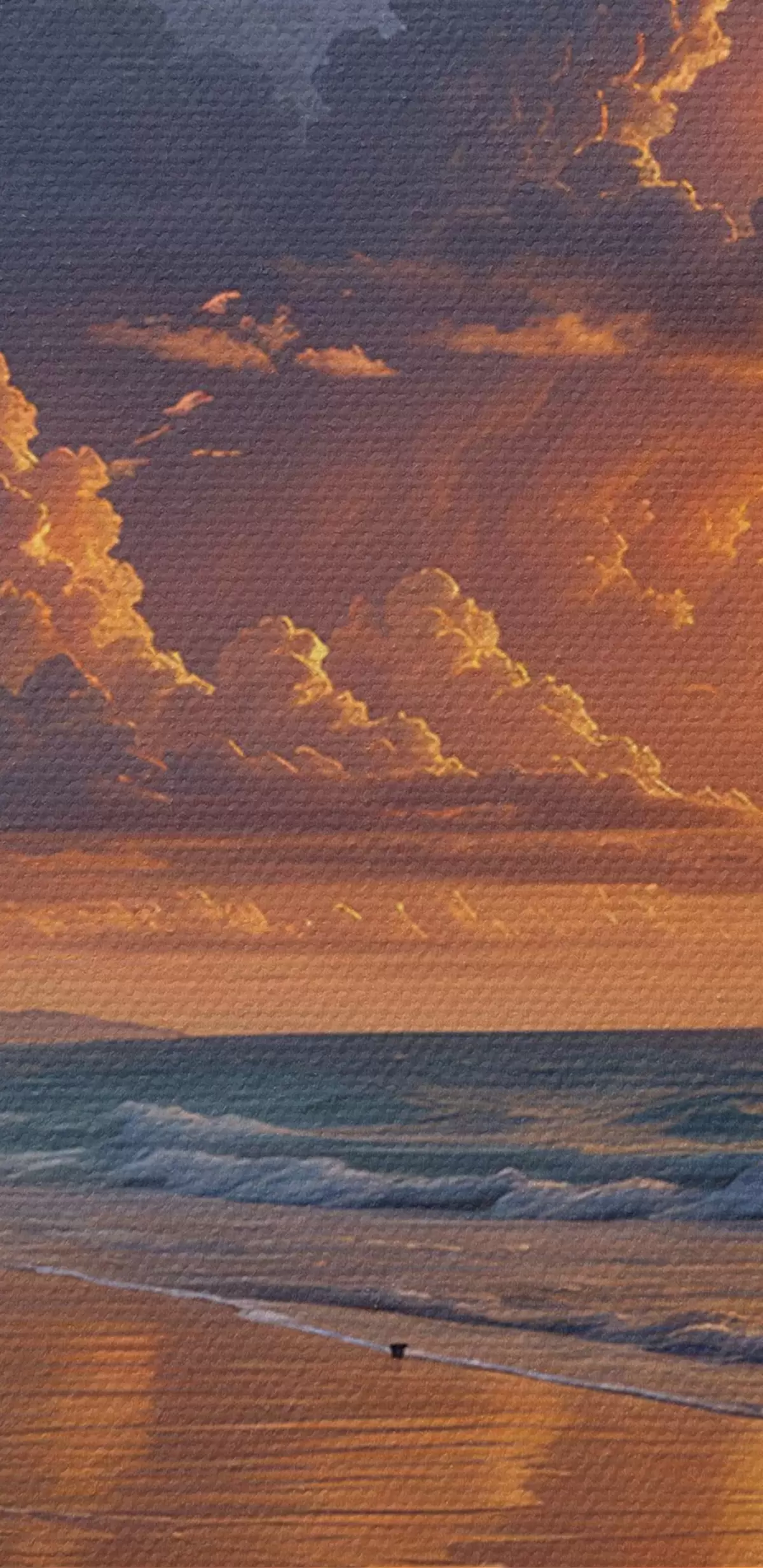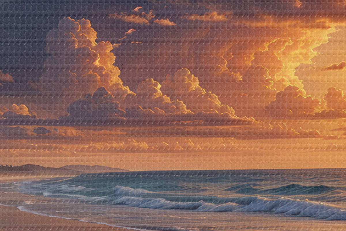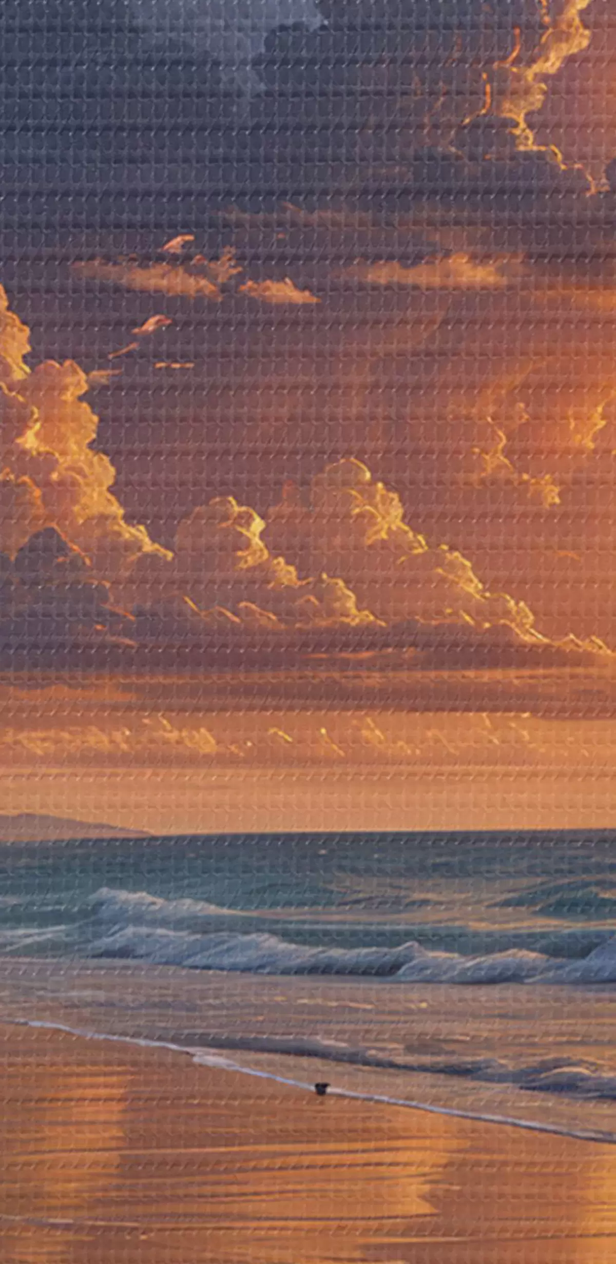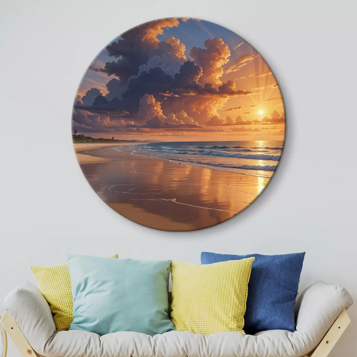 Picturi rotunde Apus de soare dramatic pe o plajă tropicală, cu nori portocalii și roz vibrante reflectându-se în apele calme Nr r40599